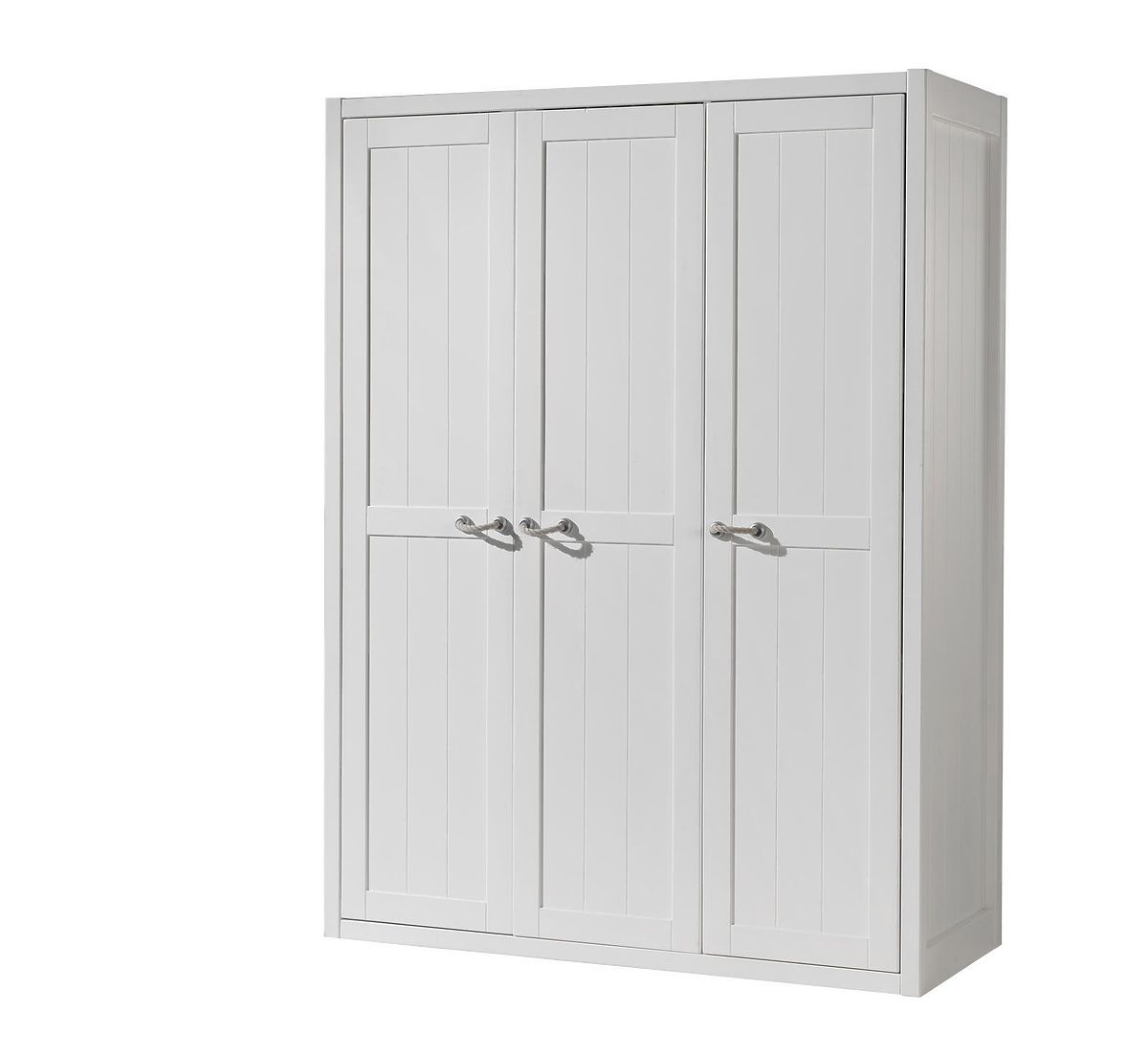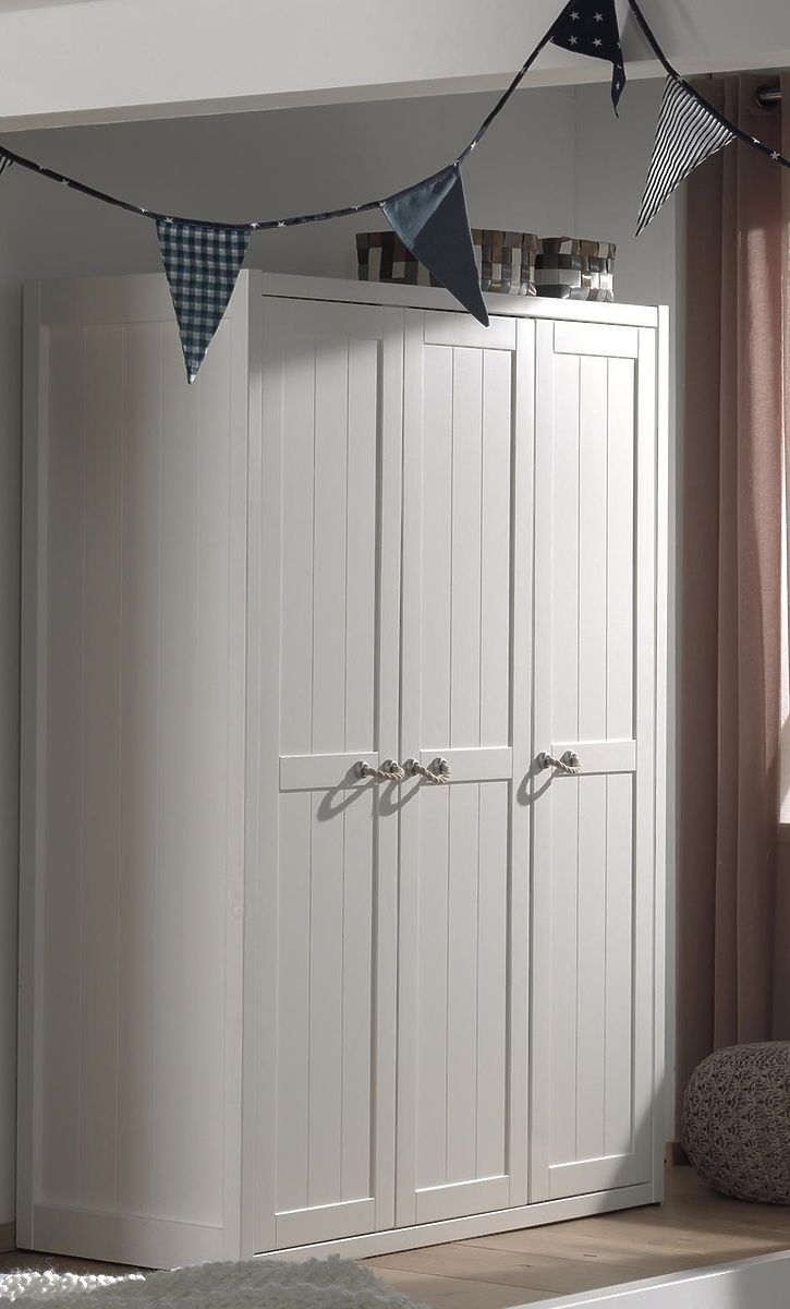 Der Kleiderschrank im eleganten maritimen Stil bietet viel Stauraum. Die Möbel aus der Lewis-Kollektion stammen von einem belgischen Hersteller, der Möbel aus den hochwertigsten Materialien liefert und die Sicherheitsnormen der Europäischen Union für die Sicherheit Ihrer Kinder voll respektiert.
