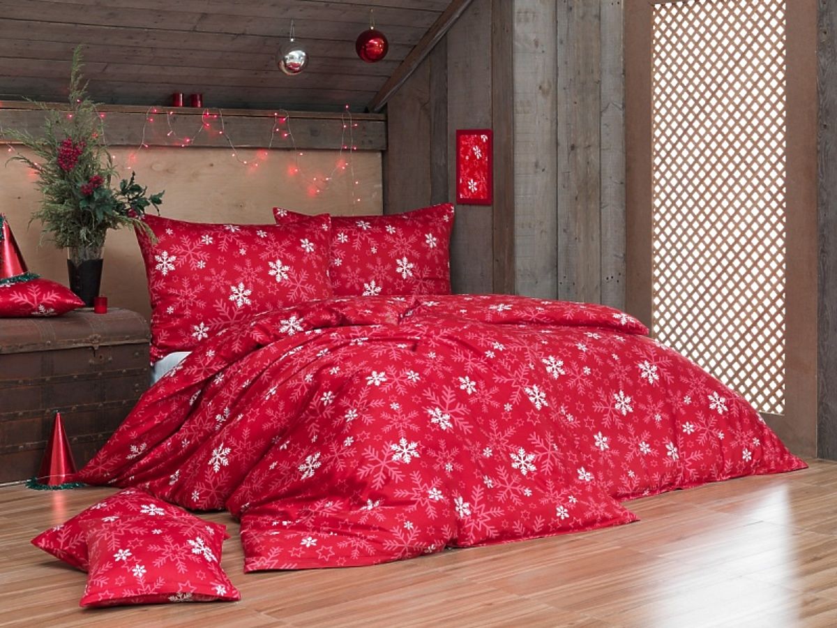 Das Baumwoll-Bettwäsche FLÖCKCHEN sieht mit seinem Schneeflocken-Muster sehr festlich aus. Ein sattes Rot bringt auch Weihnachten näher und bringt die weißen Flöckchen toll zur Geltung.