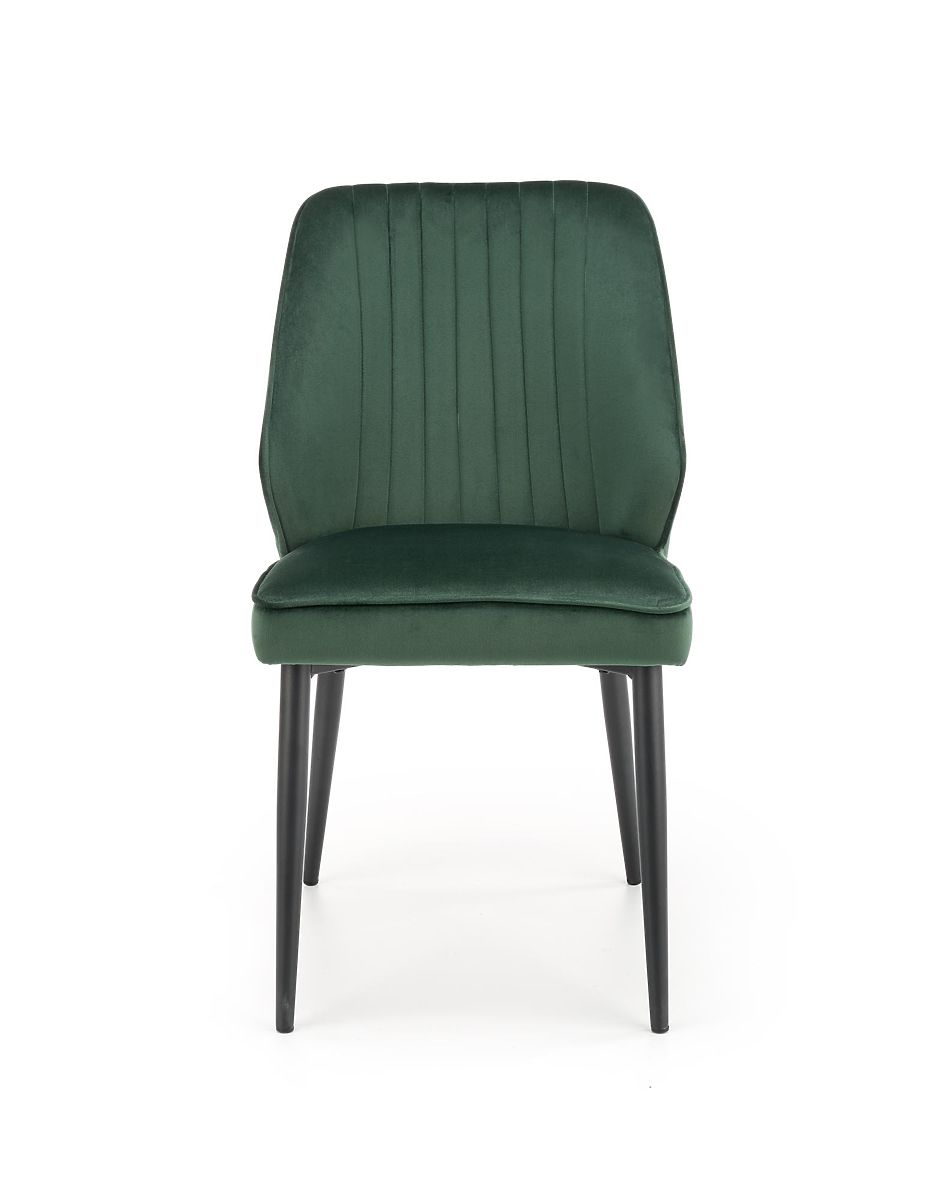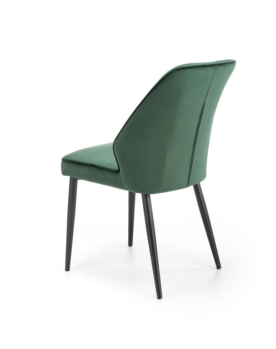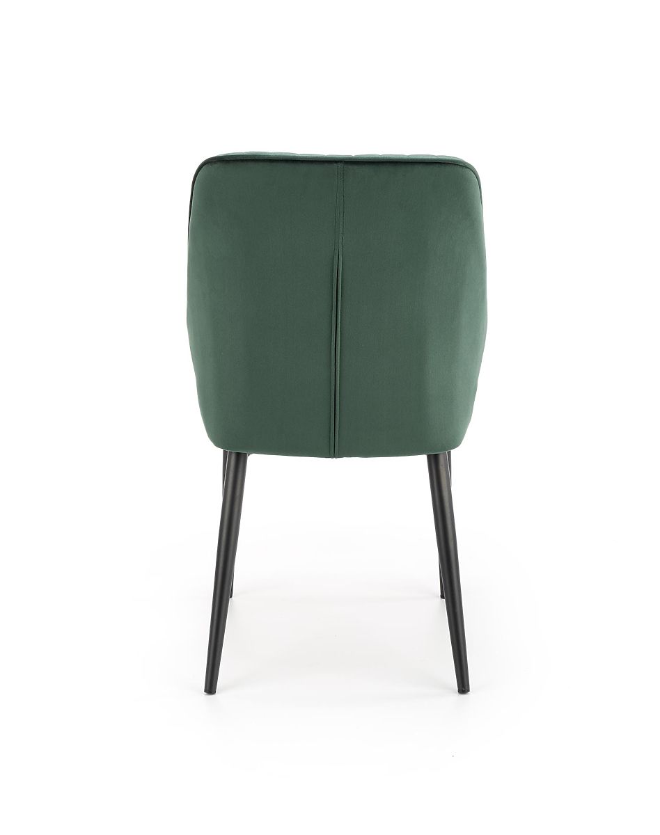 Sitz und Rückenlehne sind mit einem angenehmen Samtstoff in dunkelgrüner Farbe bezogen. Das Gestell besteht aus schwarz pulverbeschichtetem Stahl.
