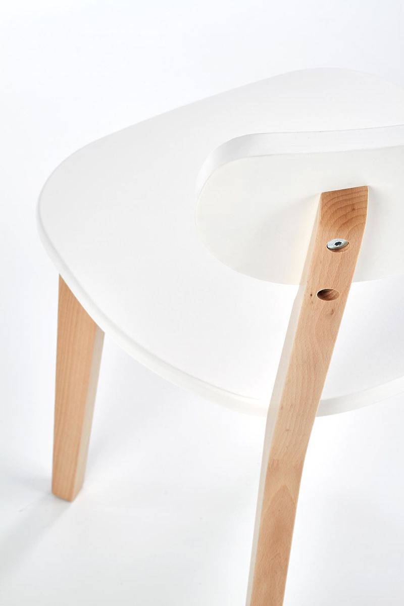 Sitz und Rückenlehne sind aus weiß lackierter MDF-Platte gefertigt. Das Gestell besteht aus massivem Buchenholz.