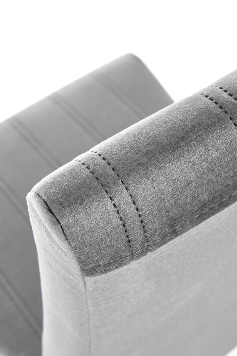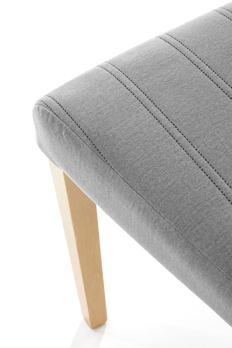 Das Gestell ist aus massivem Buchenholz in Naturfarbe gefertigt. Der gepolsterte Sitz und die Rückenlehne sind mit einem angenehmen Samtstoff in Hellgrau bezogen. Dezente gesteppten Streifen verleihen dem Stuhl Eleganz.