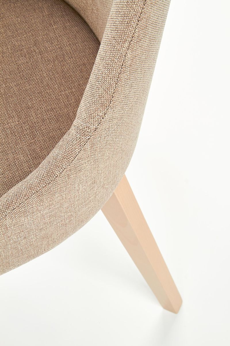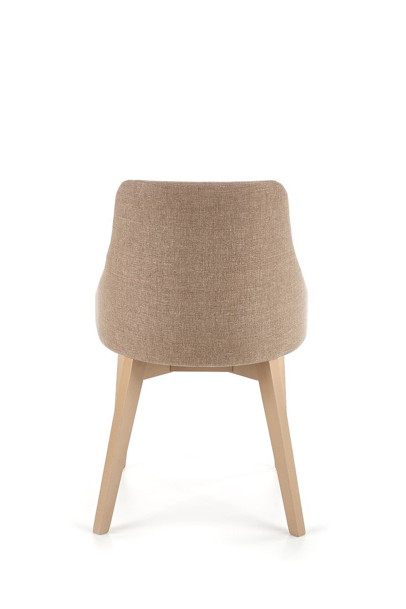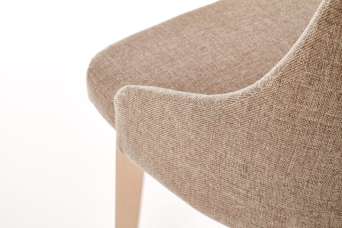 Das Gestell des Stuhls ist aus massivem Buchenholz in der Farbe Sonoma Eiche gefertigt. Sitz und Rückenlehne sind mit einem angenehmen Stoff in Braun bezogen.