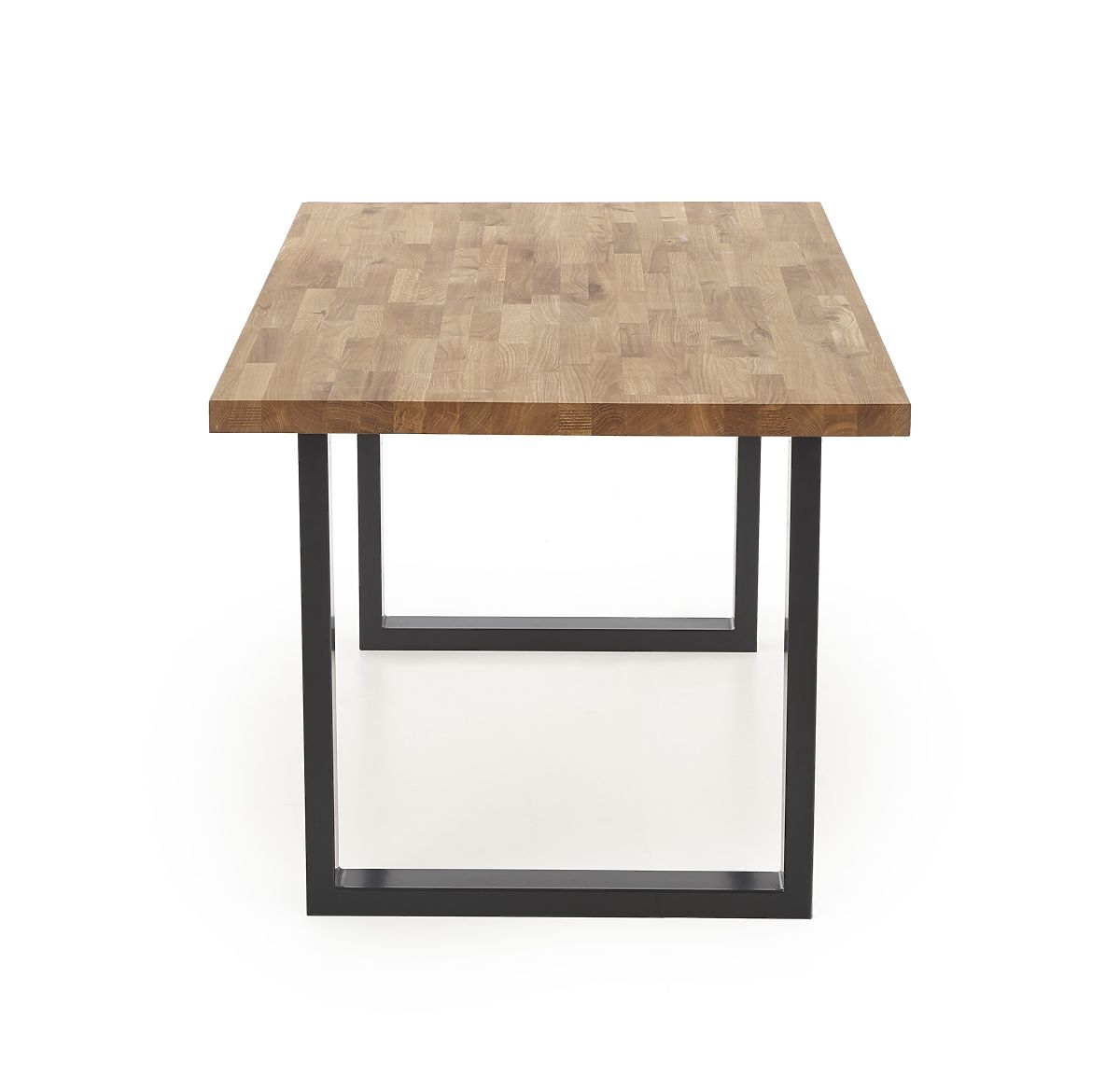 Die Tischplatte besteht aus massivem Eichenholz. Die Tischbeine sind aus schwarz pulverbeschichtetem Stahl.