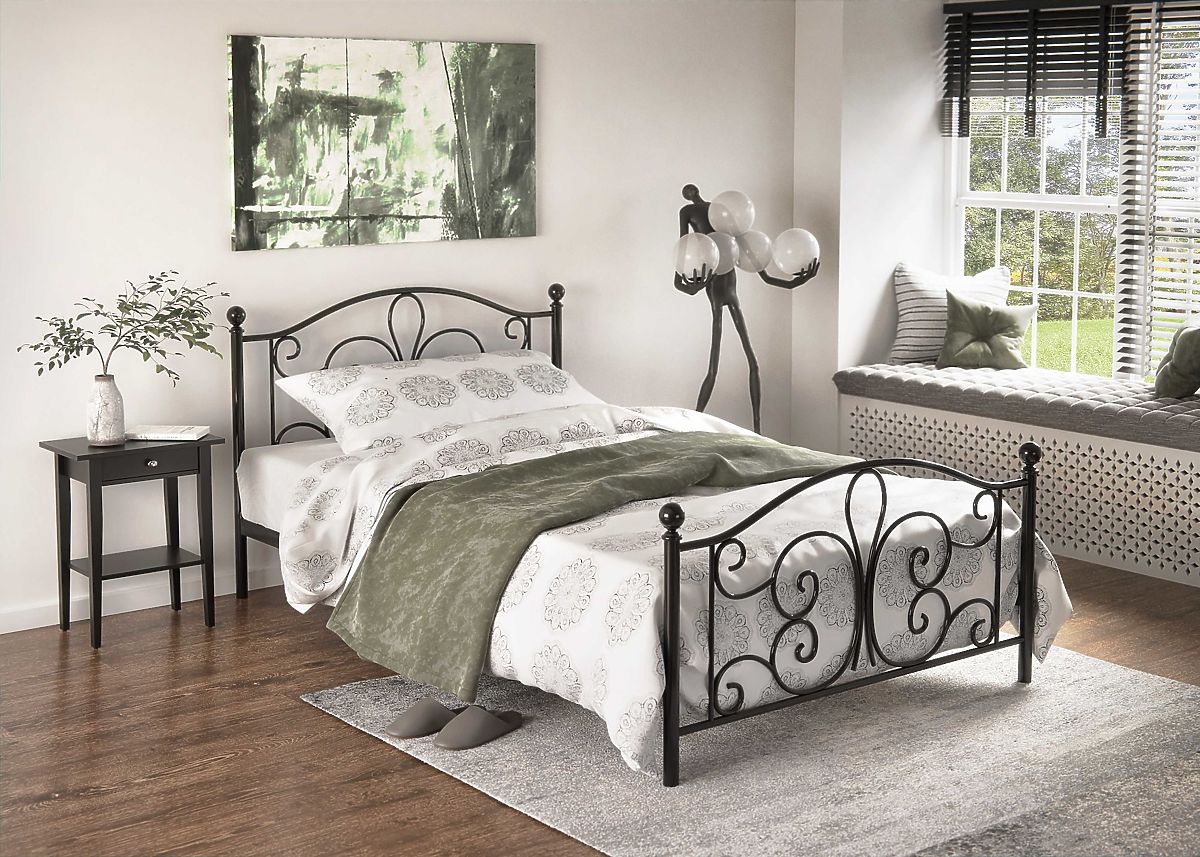 Das schwarze Metallbett Panama in der Größe 120x200 cm, elegant, modern und stilvoll, hat ein interessantes Design und eignet sich dank seiner Abmessungen nicht nur für ein Studentenzimmer , sondern auch für ein Schlafzimmer .