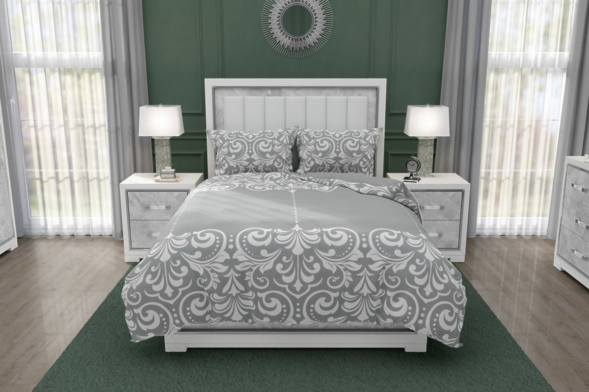 Die Bettwäsche besteht aus einem Bettbezug 140 x 200 cm und einem Kissenbezug 70 x 90 cm . Es ist doppelseitig bedruckt , wobei auf der Vorderseite die Hintergrundfarbe grau ist und weiße, in horizontalen Streifen aufgedruckte Ornamente hervorstechen. Die andere Seite des Bettlakens ist grau.
