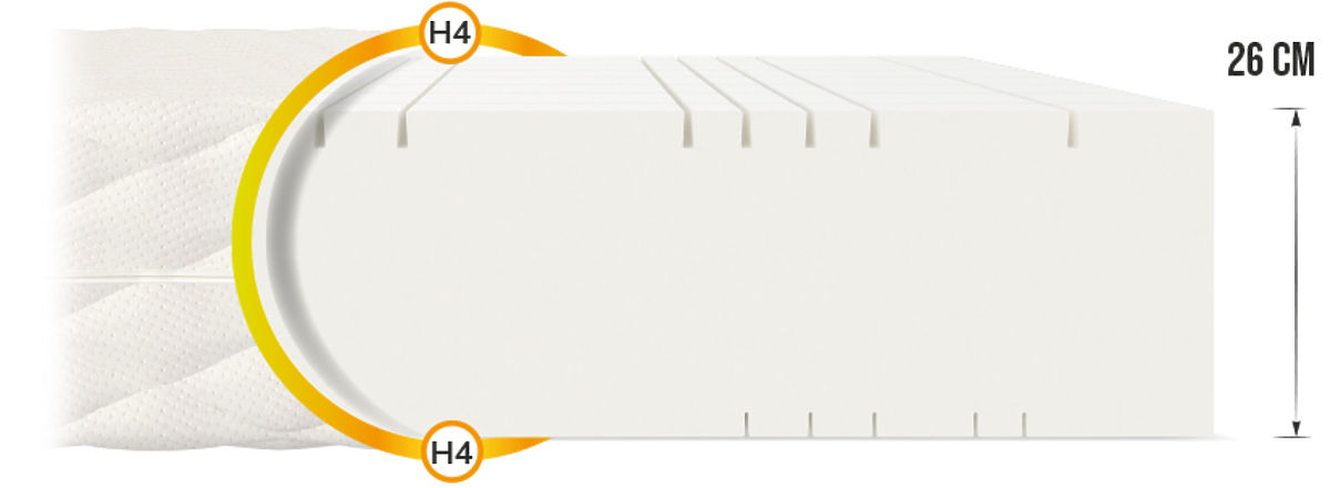 Mit einer hochwertigen Goya Max Plus Schaumstoffmatratze mit 26 cm Höhe wird Ihr Bett zum bequemsten Ort weit und breit. Durch eine Reihe von Quer- und Längsschnitten ist die doppelseitige Matratze in 7 Zonen unterteilt . Dadurch wurde eine deutliche Steigerung der Plastizität erreicht, was eine hervorragende Unterstützung der Wirbelsäule ermöglicht.