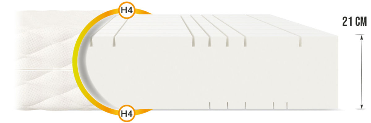 HR-Schaum zeichnet sich durch eine ungleichmäßige Zellstruktur aus und bietet somit bessere Körperunterstützung, Komfort und Elastizität. Die Matratze passt sich perfekt der Körperform an und bleibt gleichzeitig sehr leicht. Das Material ist widerstandsfähig gegen Verformungen und außergewöhnlich langlebig. Die poröse Struktur sorgt für perfekte Luftzirkulation und verhindert die Bildung von Pilzen und Schimmel. Die Oberfläche, die konturiert in Form eines Gitters geschnitten ist, zeichnet sich durch orthopädische Eigenschaften aus.