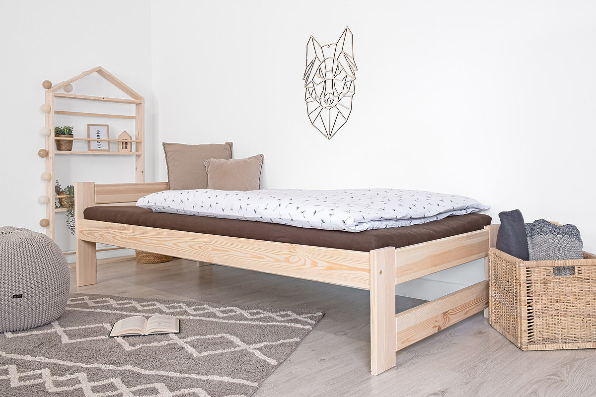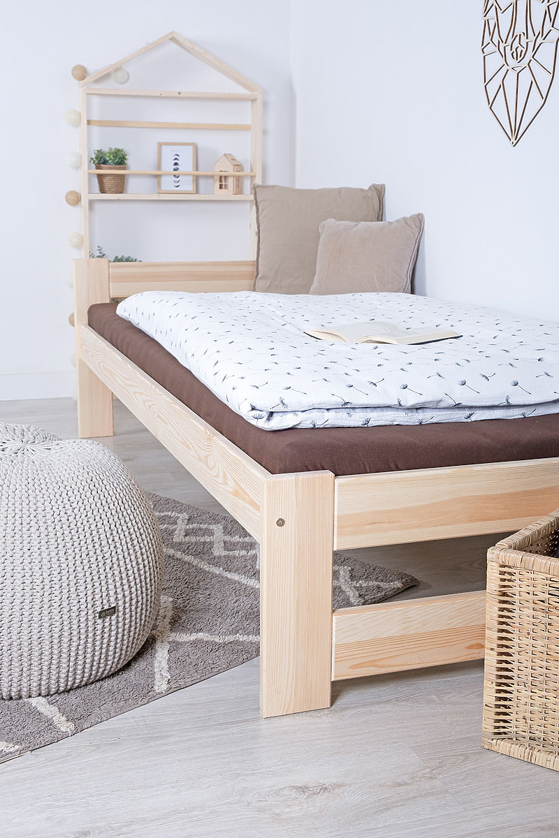 Das lackierte Bett Mel 200x90 ist so gestaltet, dass es Authentizität in Ihr Interieur bringt. Jedes Bettstück wird aus sorgfältig ausgewähltem Kiefernholz gefertigt, das gründlich lackiert wurde, um sein natürliches Aussehen und seine Textur zu betonen. Dieser Lack schützt das Holz zudem vor äußeren Einflüssen und verlängert seine Lebensdauer.