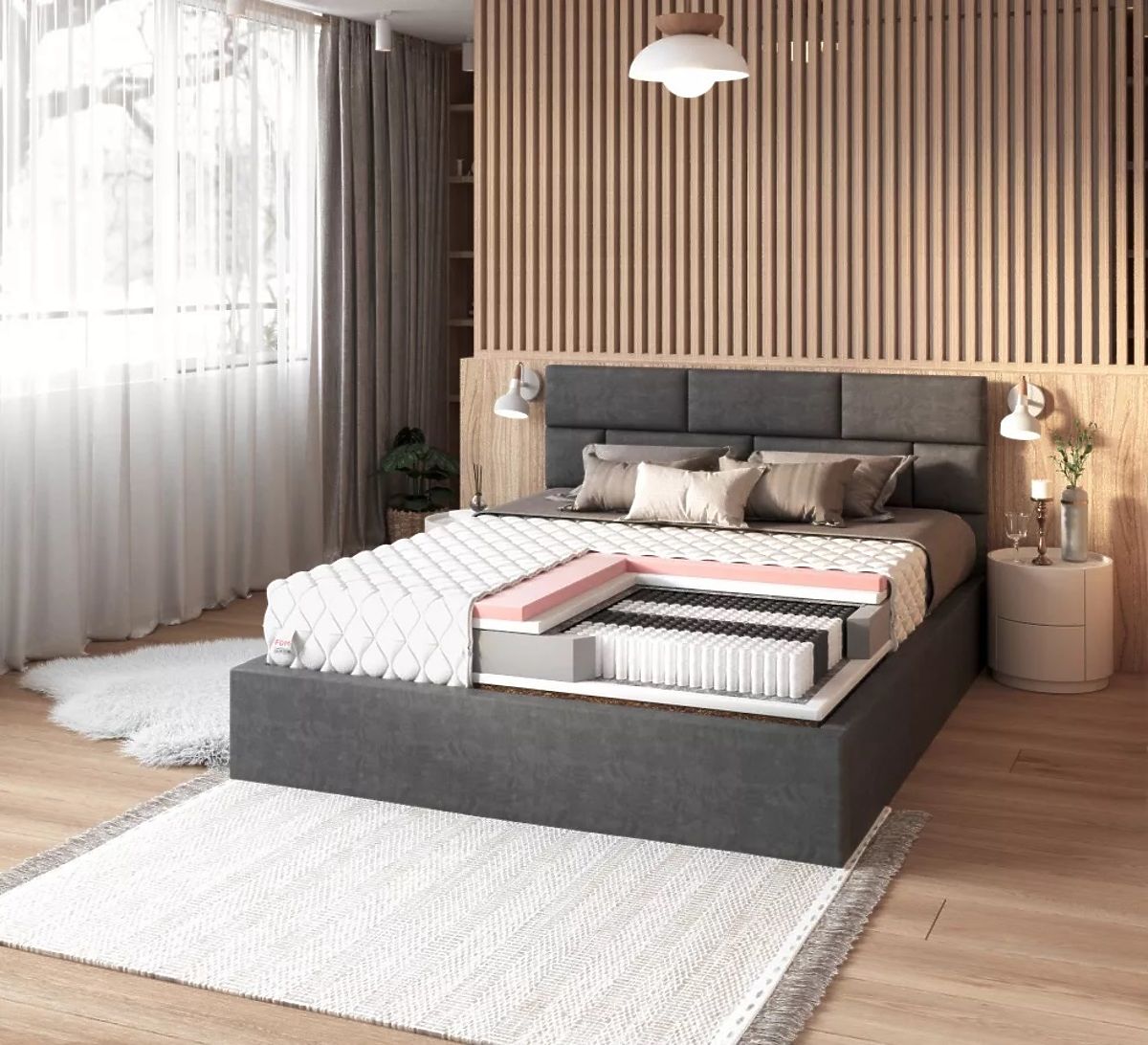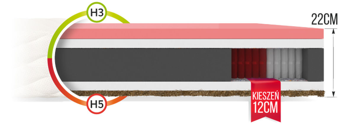Die Federn werden mit der NanoHard-Technologie hergestellt, die Festigkeit und Langlebigkeit garantiert. Die zweite Schicht besteht aus widerstandsfähigem und elastischem PU-Schaum, der eine gute Körperfederung und eine hochwertige Unterstützung der Wirbelsäule bietet. Ihr Körper passt sich perfekt an die Matratze an, und Sie wachen morgens erholt und frisch auf. Darüber hinaus sorgt thermoplastischer VISCO-Schaum dank seiner Formgedächtnisfunktion für unvergleichlichen Komfort und Bequemlichkeit. Er passt sich perfekt dem Körper an und kehrt später in seinen ursprünglichen Zustand zurück. Zur zusätzlichen Atmungsaktivität wurde eine Kokoseinlage verwendet, die als Naturmaterial die gesamte Konstruktion leicht verstärkt. Zwischen den Federn und dem Schaumstoff wurde ein Trennmaterial eingefügt. Es handelt sich um natürlichen Filz, der die Lebensdauer der Matratze erheblich verlängern und ihre Konstruktion stärken kann.