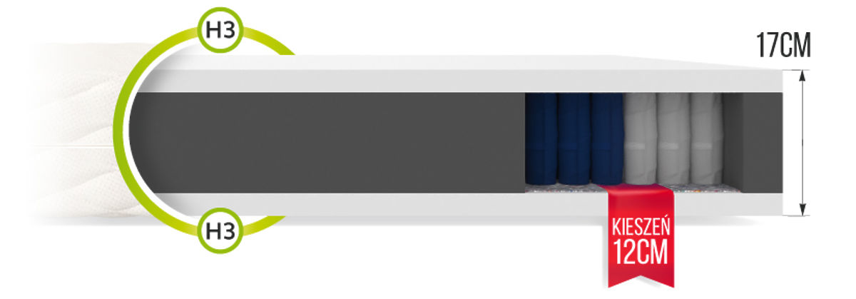 Pokud hledáte komfortní a oboustrannou matraci a upřednostňujete taštičkový typ matrace, je TREVISO o výšce 17 cm ideální volbou. Její základ tvoří kapsová forma. Taštičkové pružiny byly vyrobeny technologií NanoHARD a díky dvakrát tvrzenému drátu se výrazně prodlužuje jejich životnost. Matrace se vyznačuje 7 zónami s různou tvrdostí, což zajišťuje ergonomickou polohu těla během odpočinku. Pružiny pracují nezávisle na sobě, což eliminuje efekt ohýbání velké plochy matrace při tlaku na její malou část. Díky tomu nepocítíte žádné otáčení či vrtění druhé osoby, což zajistí hluboký a ničím nerušený spánek. Kapsová vložka je obklopena pur pěnou T25, která má vysokou odolnost proti deformaci, je pružná, dobře prodyšná a stabilizuje tělo během odpočinku. Mezi pružiny a pěnu byl vložen oddělující materiál. Jedná se o přírodní plsť, která může výrazně prodloužit životnost matrace a posílit její konstrukci.