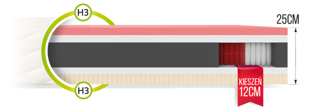 Auf einer Seite der Matratze befindet sich eine sehr flexible Latexschicht , die den Komfort verbessert, und dank der perforierten Struktur ist sie hervorragend atmungsaktiv . Die nächste Schicht besteht aus T25-Pur-Schaum , dessen Vorteile eine hohe Verformungsbeständigkeit, Elastizität, Atmungsaktivität und die Stabilisierung des Körpers im Ruhezustand sind. Zwischen den Federn und dem T25-Pur-Schaum wurde ein Trennmaterial eingelegt. Dabei handelt es sich um einen Naturfilz, der die Lebensdauer der Matratze deutlich verlängern und ihre Struktur stärken kann. Der Schlafkomfort wird durch den thermoplastischen VISCO-Schaumstoff , der sich auf der anderen Seite der Matratze befindet, enorm erhöht. Durch den Einfluss der Körpertemperatur und des Körpergewichts werden die natürlichen Rundungen des Körpers perfekt nachgebildet , wodurch die korrekte Unterstützung der gesamten Figur gewährleistet wird. VISCO und Federn sind wiederum durch eine Schicht aus strapazierfähigem T25-Purschaum und einem natürlichen Trennmaterial getrennt.
