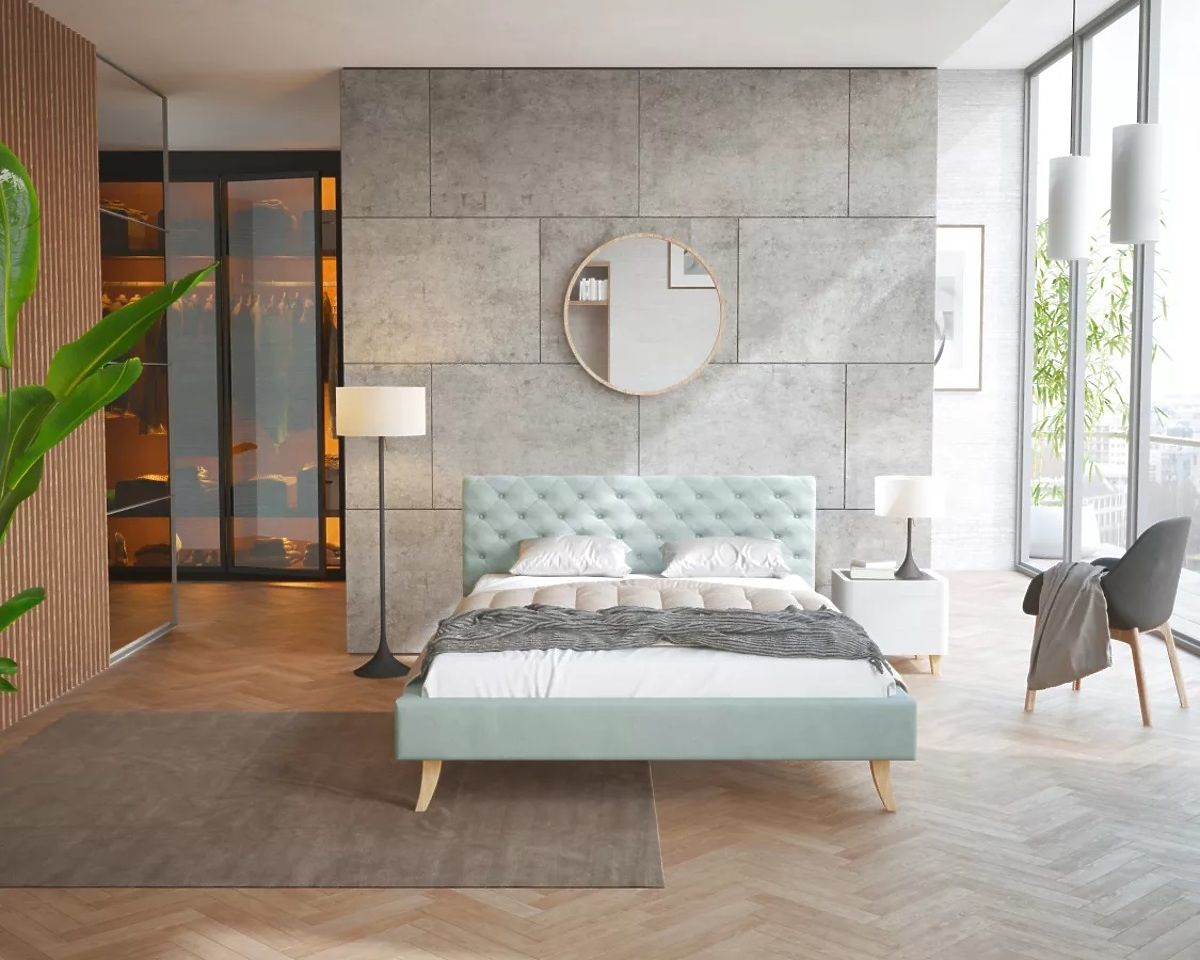 Das Polstermaterial des Polsterbettes ist der mintfarbene Veloursstoff Trinity . Es zeichnet sich durch eine feine Struktur und gleichzeitig hohe Beständigkeit gegenüber Sonnenlicht aus. Es ist weich, flauschig und fühlt sich angenehm an . Es ist außerdem sehr abrieb- und pillingbeständig. Es überzeugt durch seine moderne Optik und die Ziernaht am Kopfende des Bettes.