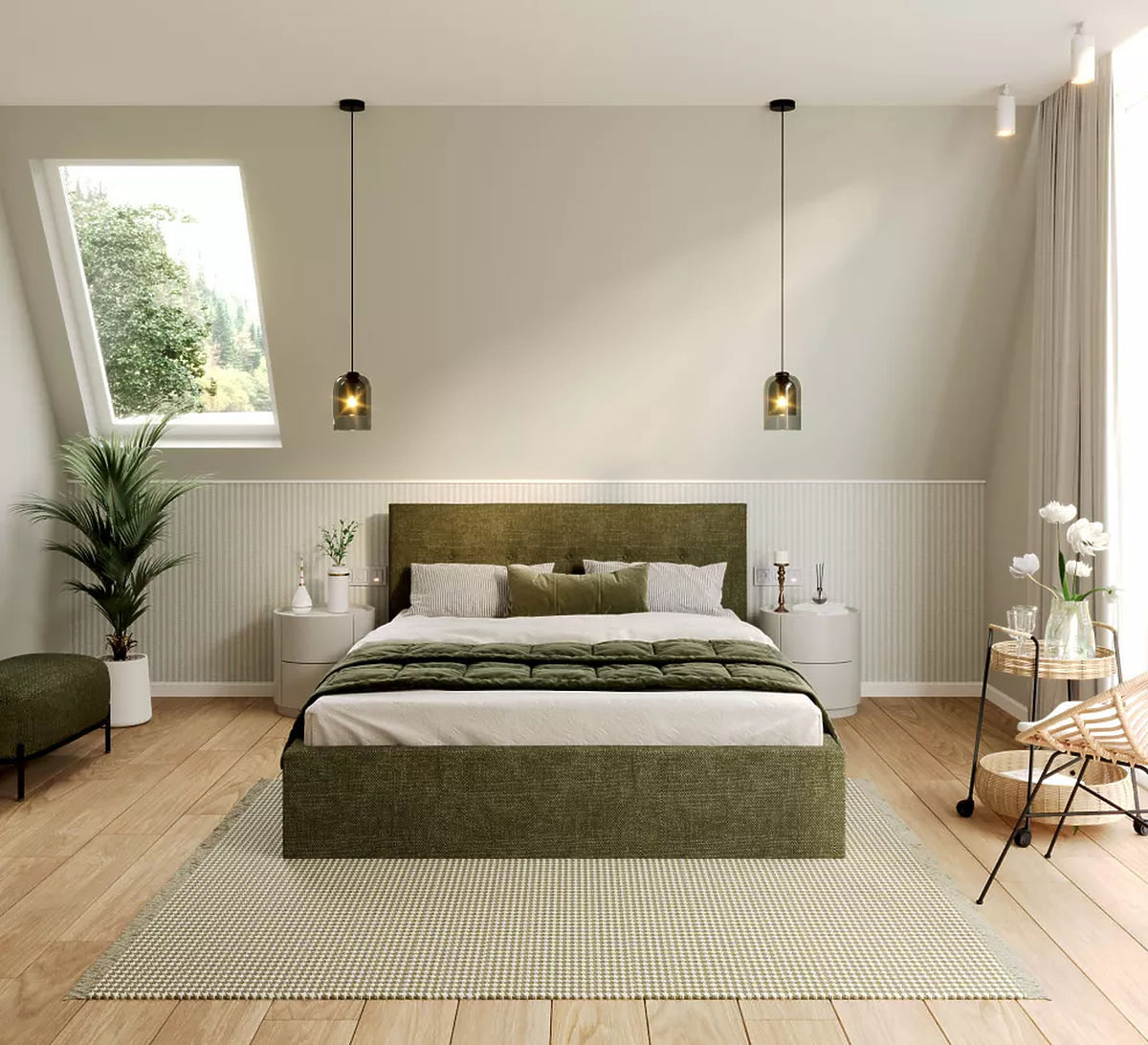 Wunderschönes TULSA-Polsterbett in der Farbe Olivgrün mit den Maßen 120 x 200 cm . Dieses Bett vereint Komfort, zeitloses Design und Qualität. Die olivgrüne Farbe verleiht dem Schlafzimmer Frische und Originalität, während das gepolsterte Kopfteil dem Raum Weichheit und Eleganz verleiht. Mit den Maßen 120 x 200 cm bietet das Bett ausreichend Platz für zwei Personen zum bequemen Schlafen.