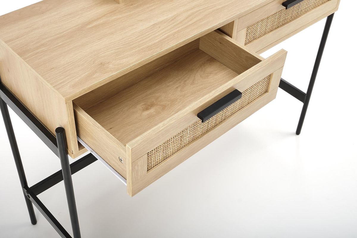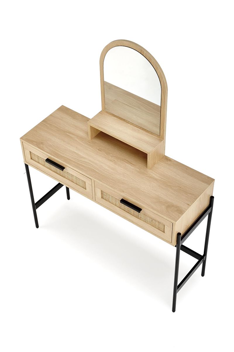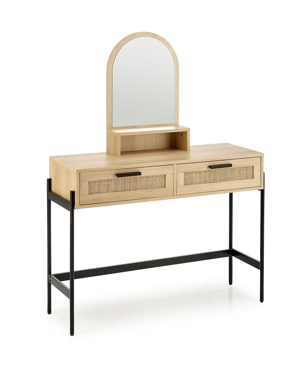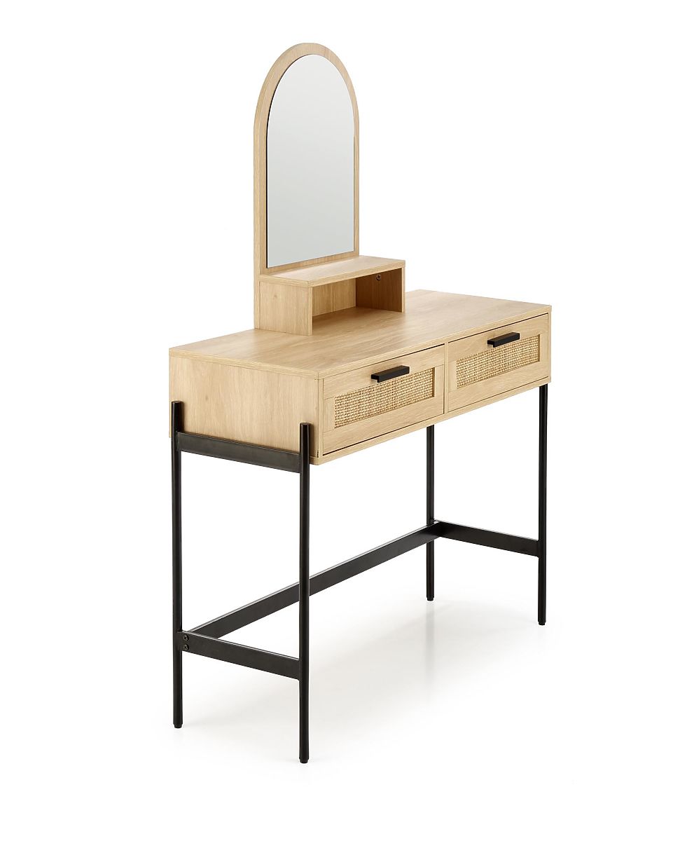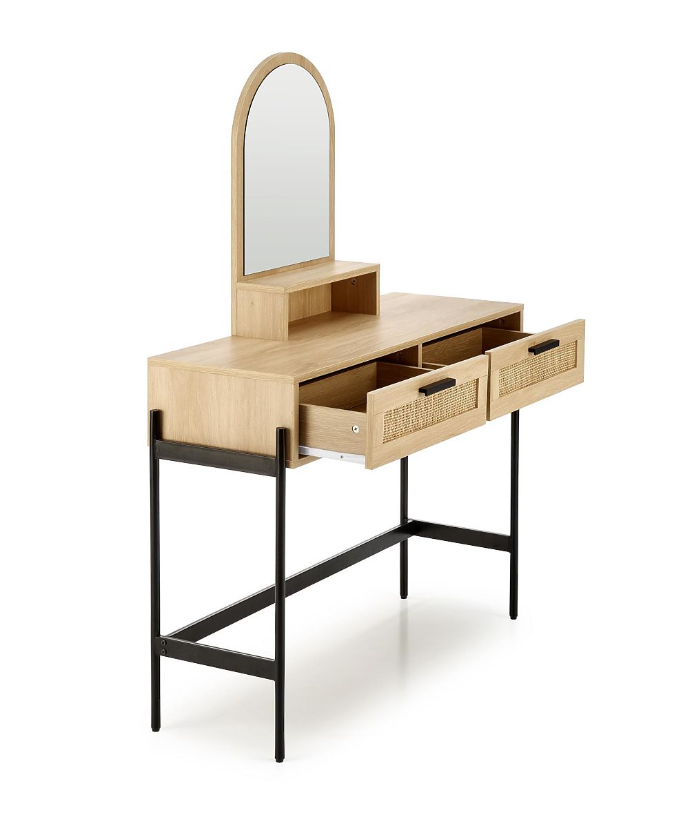 Der Tisch ist mit zwei verschließbaren Schubladen und einem praktischen Spiegel ausgestattet, wodurch Sie Ihre kosmetische Pflege und Ihr Make-up bequem durchführen können. Dieser Rattantisch schafft den perfekten Platz für Ihre persönliche Schönheitspflege.