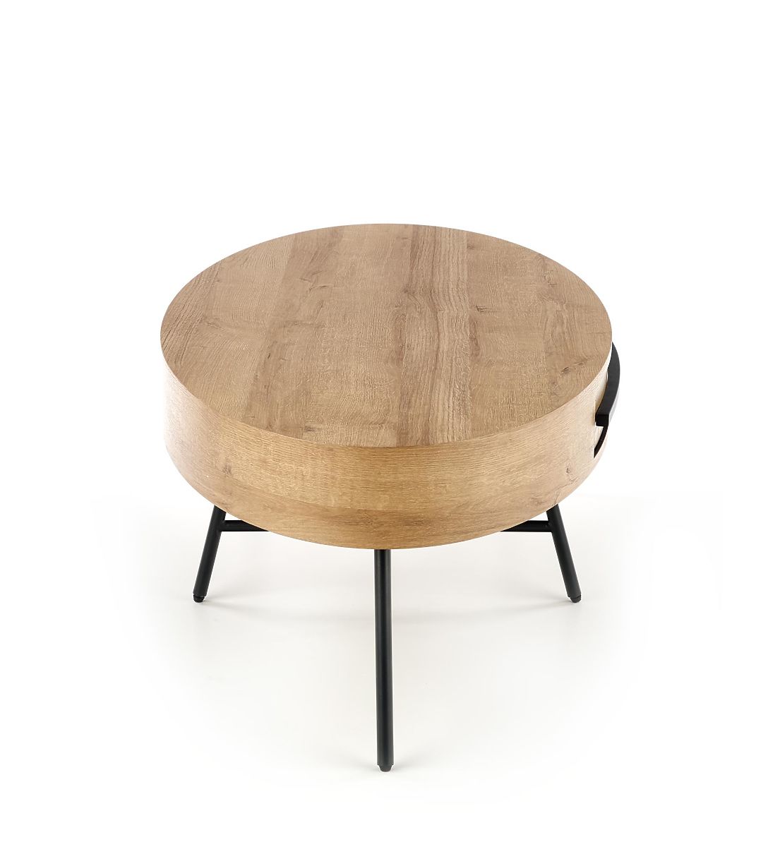Der elegante ovale Couchtisch Carolina bezaubert durch seine einzigartige Kombination aus luxuriösen Elementen und Funktionalität. Der Tisch besteht aus furniertem MDF im goldenen Eichendekor. Schwarze Metallbeine sorgen für eine stabile Basis.