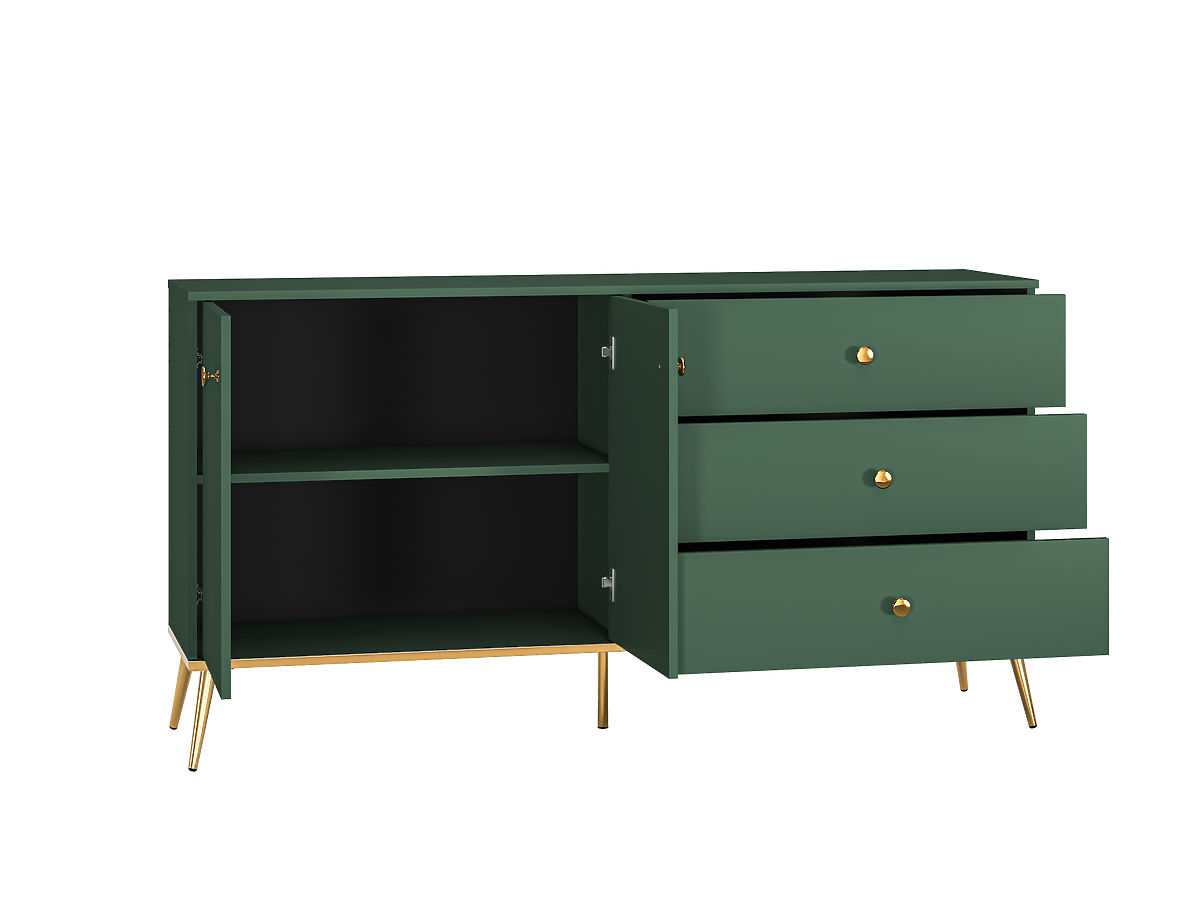 Die größere Kommode Forest ist eine Kombination aus Eleganz, Zweckmäßigkeit und modernem Design. Die dunkelgrüne Farbe bringt Ruhe und Harmonie und stellt in Kombination mit den goldenen Griffen und Beinen ein einzigartiges Möbelstück dar. Es passt perfekt in ein modernes Interieur sowie zum Wohnen im Retro-Stil.