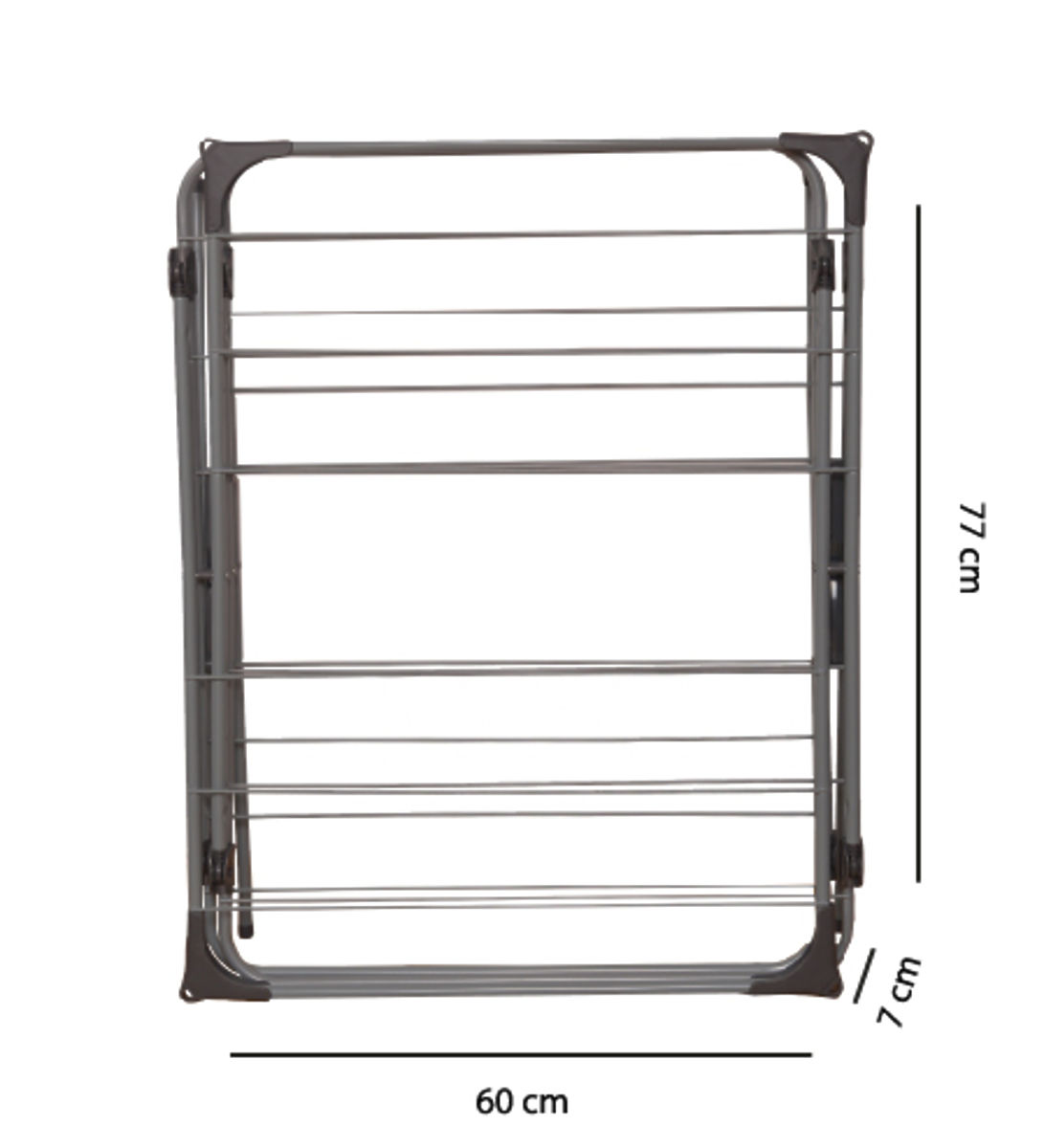 KLAPPBARE KONSTRUKTIONEine sehr wichtige Eigenschaft des Ständers ist seine Größe nach dem Zusammenklappen. Der vertikale Wäscheständer lässt sich auf kleine Maße 7x60x77cm zusammenklappen. Diese Größe ermöglicht eine problemloses Verstauen im Schrank oder in einem kleinen Lagerraum. Es dauert nur 15 Sekunden, um den Ständer auf- oder zusammenzuklappen.