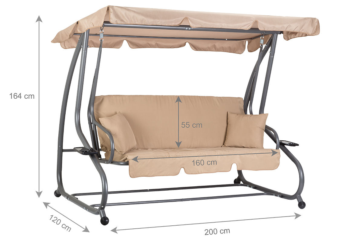 GARTENSCHAUKEL 2-IN-1Die Schaukel der Marke ModernHome kann dank ihrer Konstruktion zwei Funktionen erfüllen. Jederzeit kann die traditionelle Gartenschaukel in eine große funktionale Liege verwandelt werden, auf der bis zu zwei Personen liegen können. Ein kurzer Schlaf an der frischen Luft gibt jedem positive Energie und das große verstellbare Dach schützt uns vor starker Sonne.