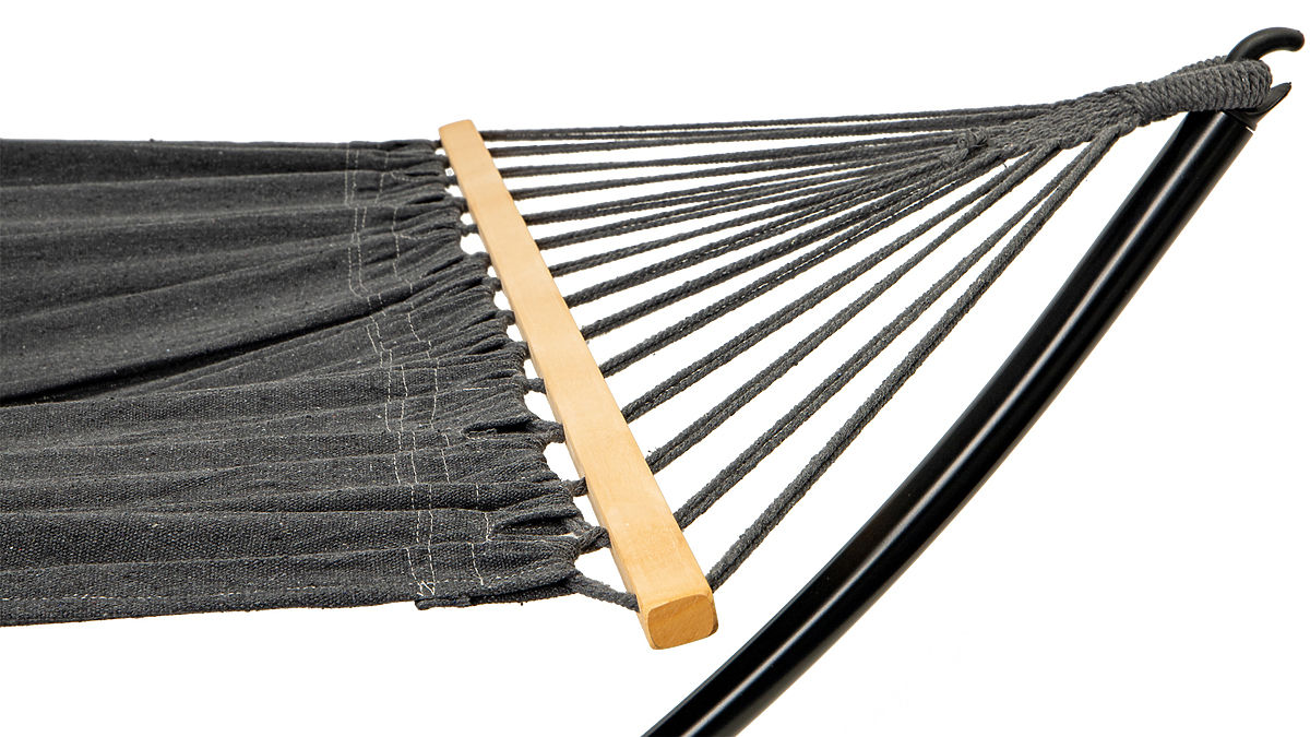 Die Hängematte besteht aus einem strapazierfähigen Material, das sich perfekt an den Körper anpasst. Holzstäbe, durch die die Befestigungsseile geführt werden, sorgen dafür, dass die Liegefläche richtig gespannt ist und sich nicht verdreht.