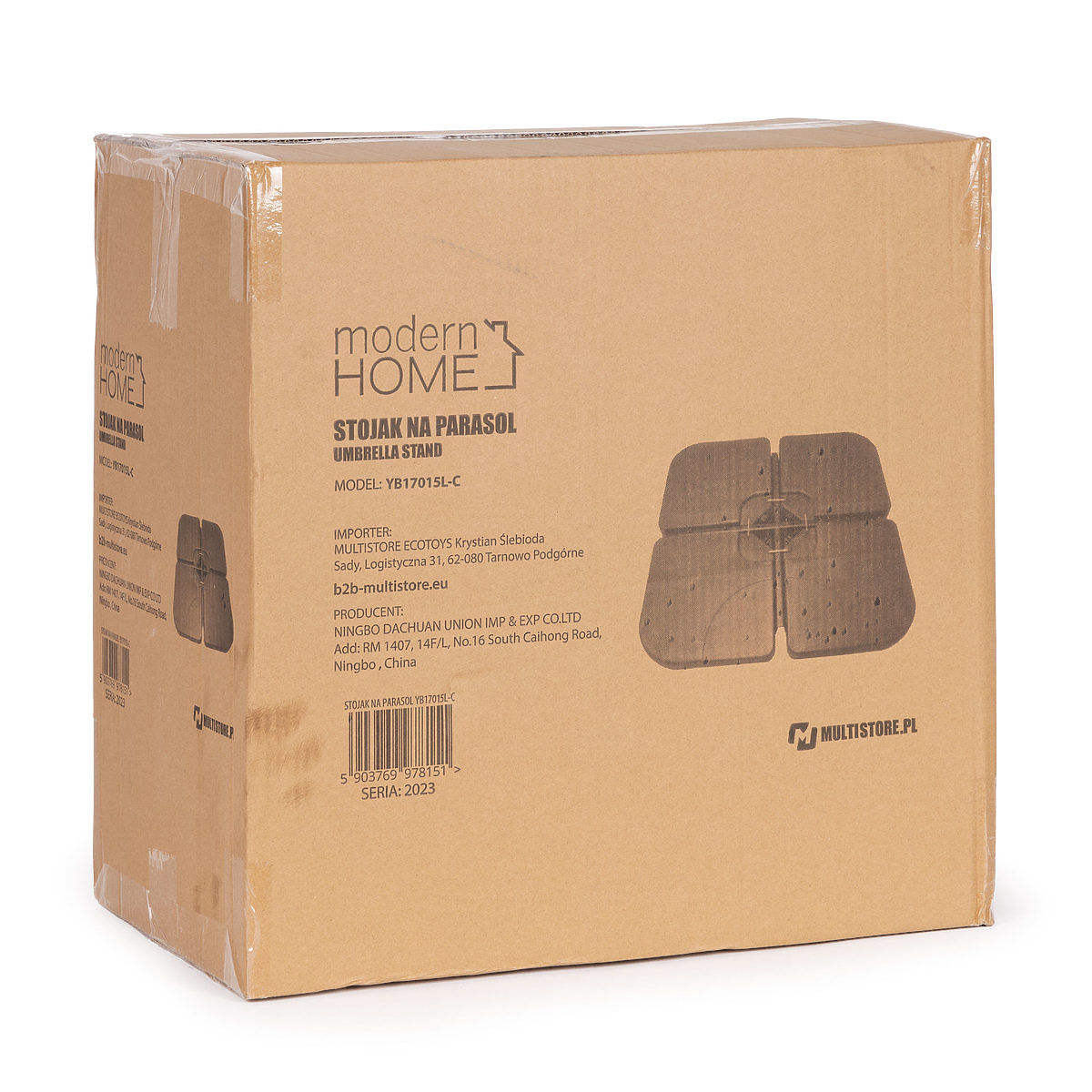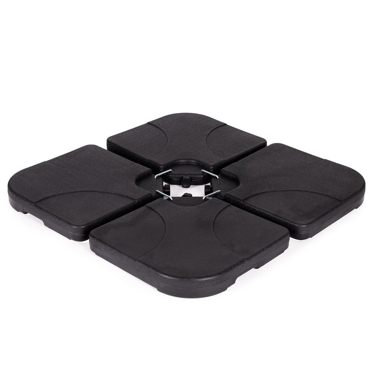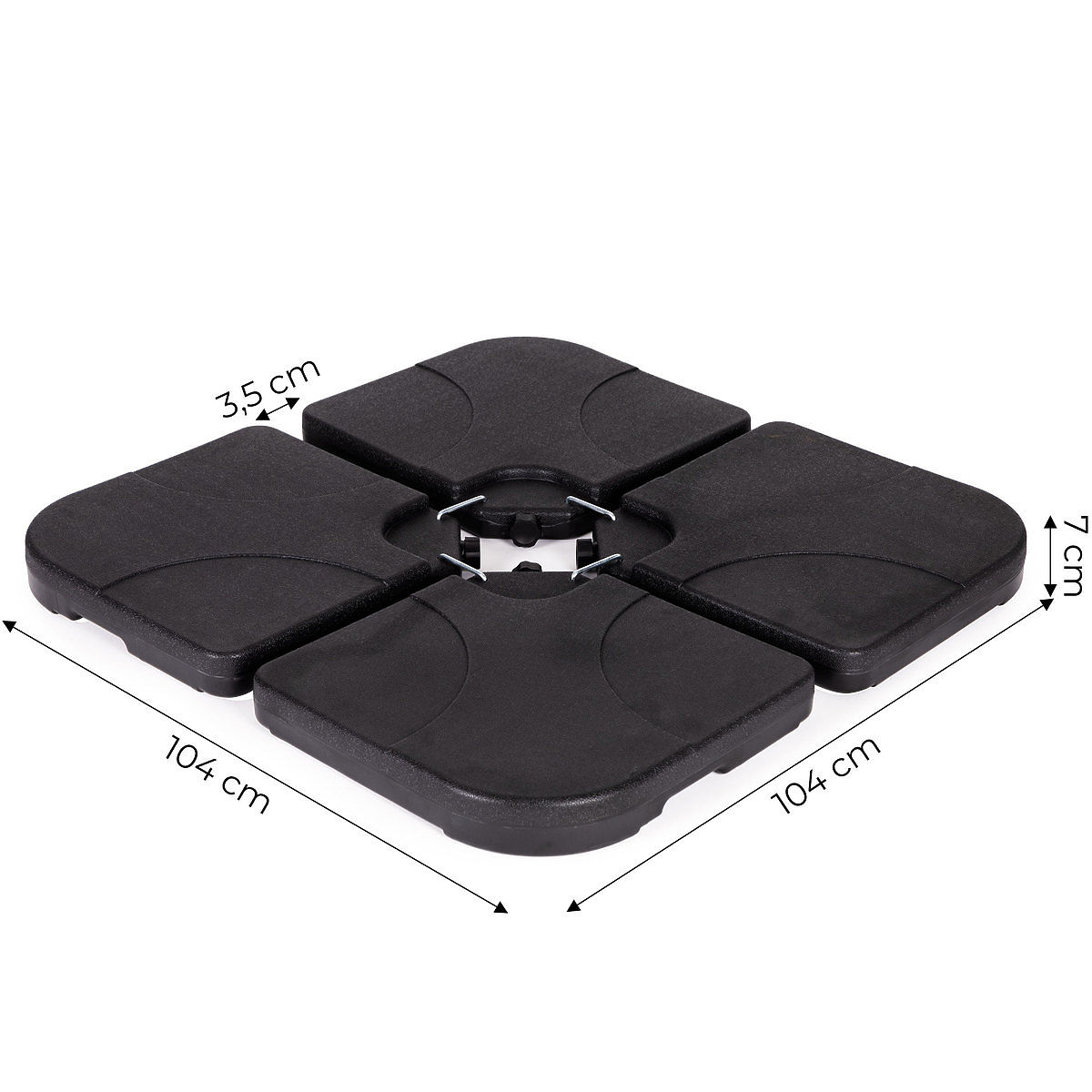 STABIL UND PRAKTISCHJedes der 4 Elemente der Basis hat einen abnehmbaren Verschluss, nach dessen Abschrauben die Basis mit Wasser gefüllt werden muss. Der mit Wasser gefüllte Panel fasst bis zu 15 l, das Gesamtgewicht des Gewichts nach dem Befüllen beträgt etwa 60 kg, was es ermöglicht, auch einen großen Sonnenschirm zu halten.
