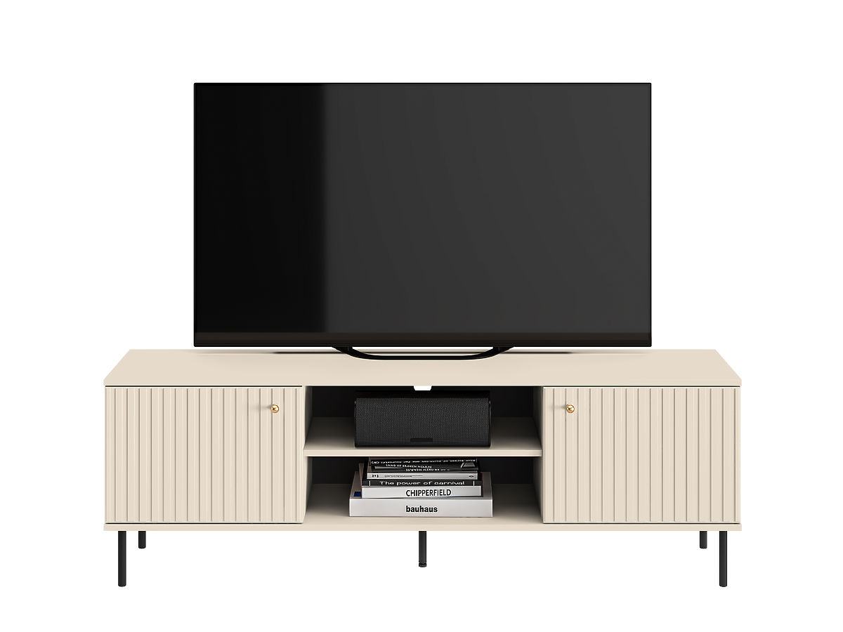 Der TV-Tisch Sophie im beigen Design vereint Eleganz, Zweckmäßigkeit und modernes Design. Dank des großen Stauraums bietet er ausreichend Platz für diverse elektronische Geräte, Bücher oder andere Dinge. Ein interessantes Element des Möbels ist die moderne gefräste Tür, ergänzt durch elegante goldene Griffe und schwarze Metallbeine. Der Fernsehtisch ist eine tolle Ergänzung für das Wohnzimmer.