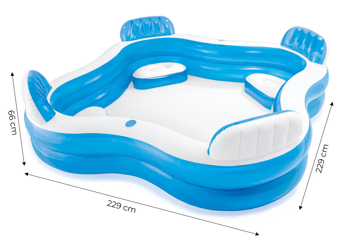 Der Pool besteht aus PVC-Material, hat eine angenehme Farbgebung und Sitze mit Rückenlehnen in jeder der vier Ecken - die ideale Wahl für Entspannung für Sie und Ihre Familie.