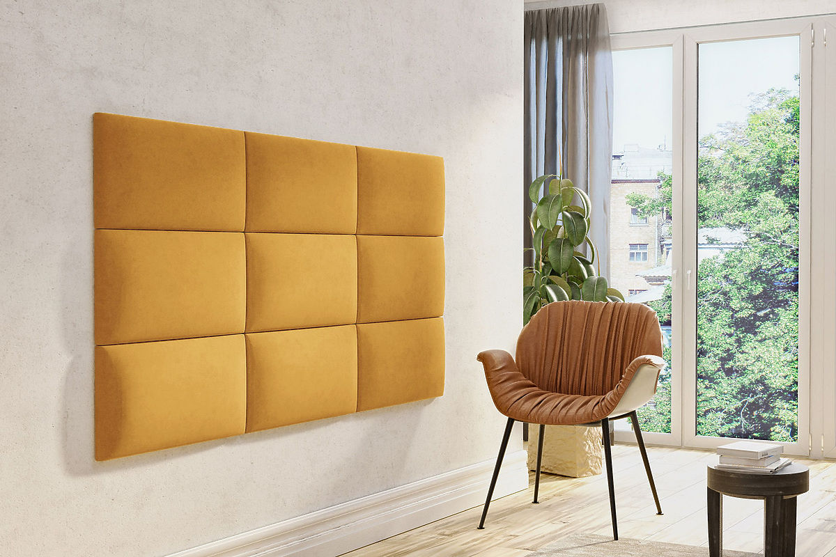 Die gepolsterten Paneele Klasik in Senfgelb sind in drei verschiedenen Größen erhältlich: