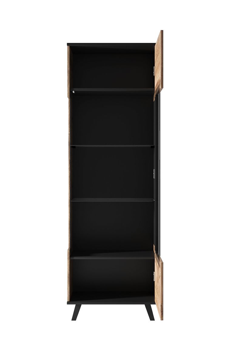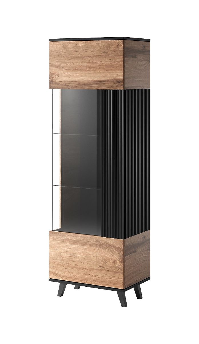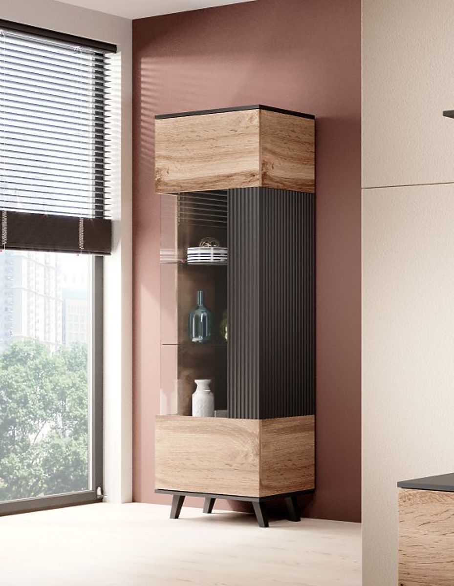 Farbe: Die Kombination aus Wotan Eiche und Schwarz verleiht der Vitrine ein modernes und anspruchsvolles Aussehen, das sich leicht in jeden Einrichtungsstil einfügt.