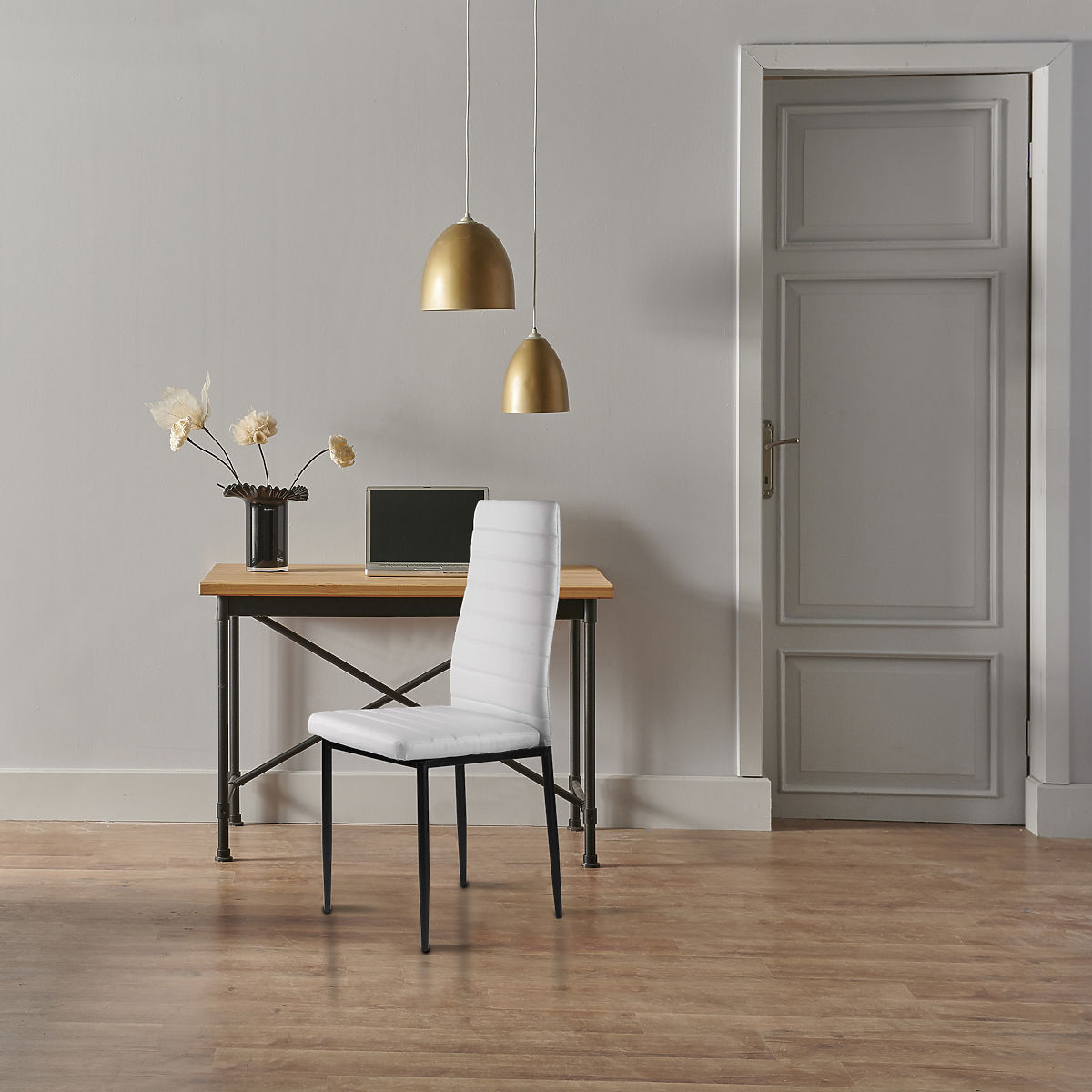 Die Stühle passen perfekt zu Ihrem Familientisch im Esszimmer und in der Küche. Die weiße Polsterung aus weichem Ökoleder und die einfachen schwarzen Beine bilden eine interessante Kombination, die dafür sorgt, dass die Stühle großartig aussehen und in jeden Einrichtungsstil passen, ihm einen außergewöhnlichen Charakter verleihen.