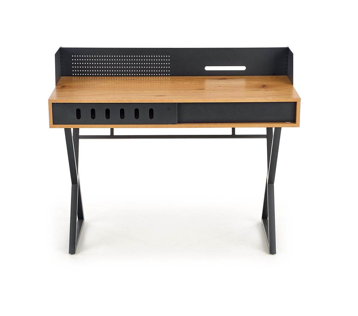 Moderner Schreibtisch mit elegantem Design, das goldene Eiche und Schwarz kombiniert. Er ist aus furniertem MDF und pulverbeschichtetem Stahl gefertigt, was hohe Qualität und Haltbarkeit gewährleistet. Ideal für das Home Office oder die Arbeitsecke.