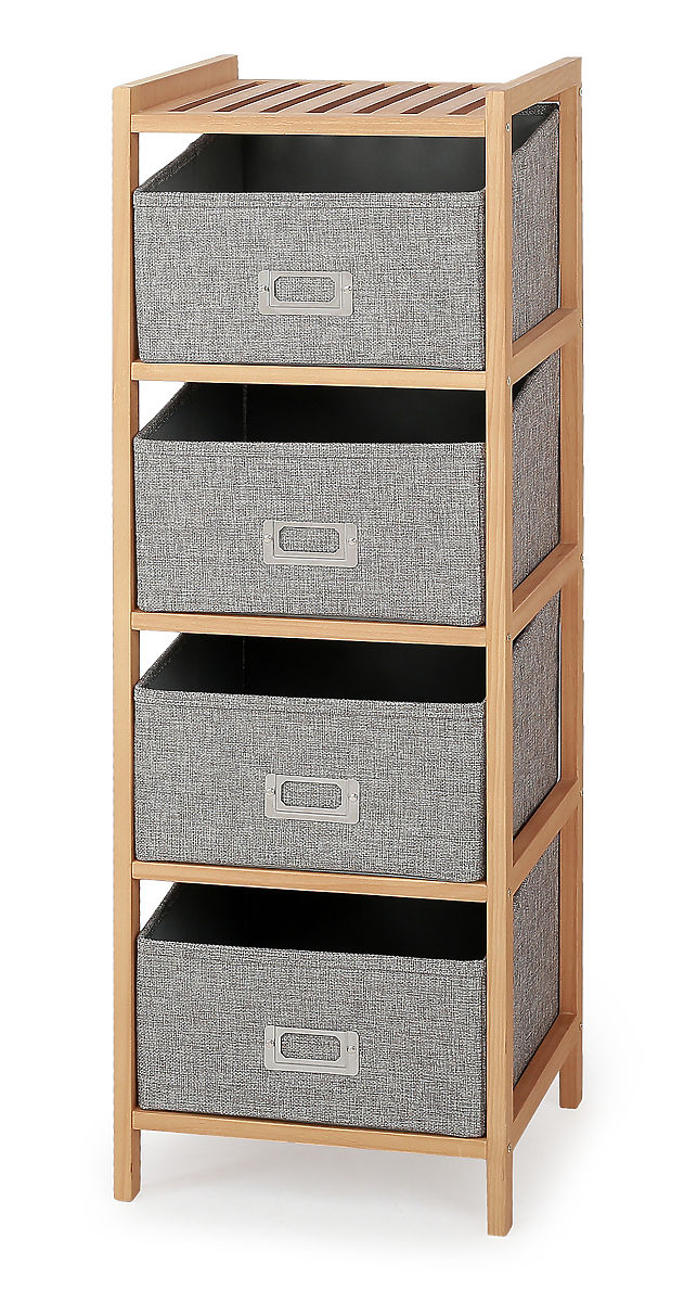 Stilvolles Holzregal mit grauen Stoffboxen für praktischen Stauraum. .. mehr