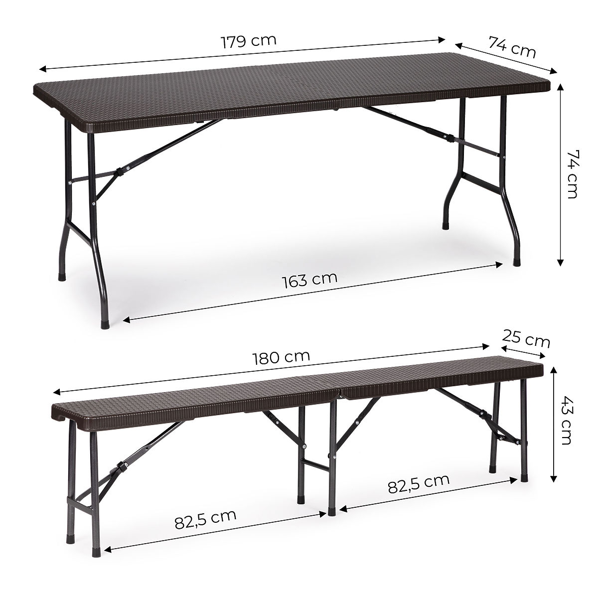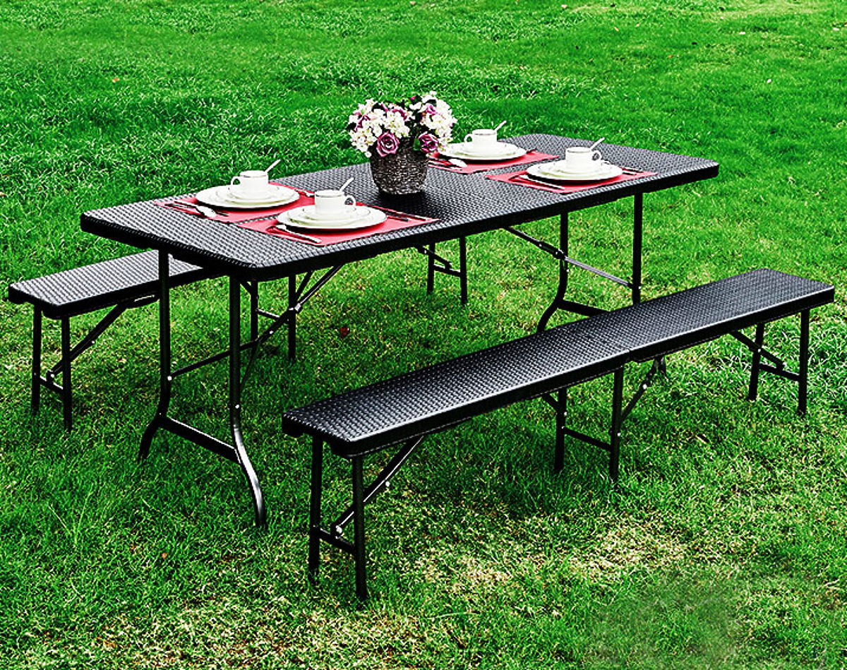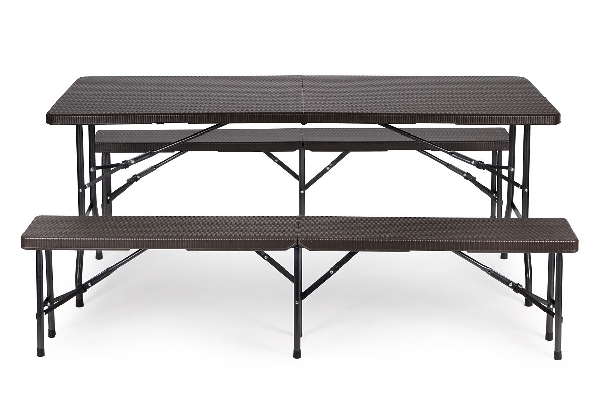 Das Set bietet Platz für 8 Personen, die Höhen der Bänke und des Tisches sind so gestaltet, dass sie Komfort und eine bequeme Position bei Outdoor-Treffen gewährleisten. Die Möglichkeit, die Möbel zu einem Koffer zusammenzuklappen, spart Platz bei der Lagerung und erleichtert den Transport.