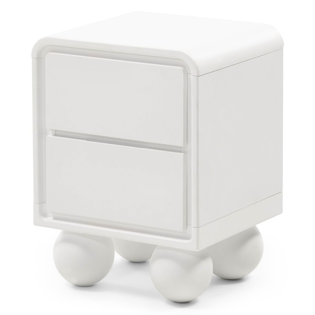 Weißer Nachttisch Lauria mit Kugelbeinen und zwei Schubladen. .. mehr
