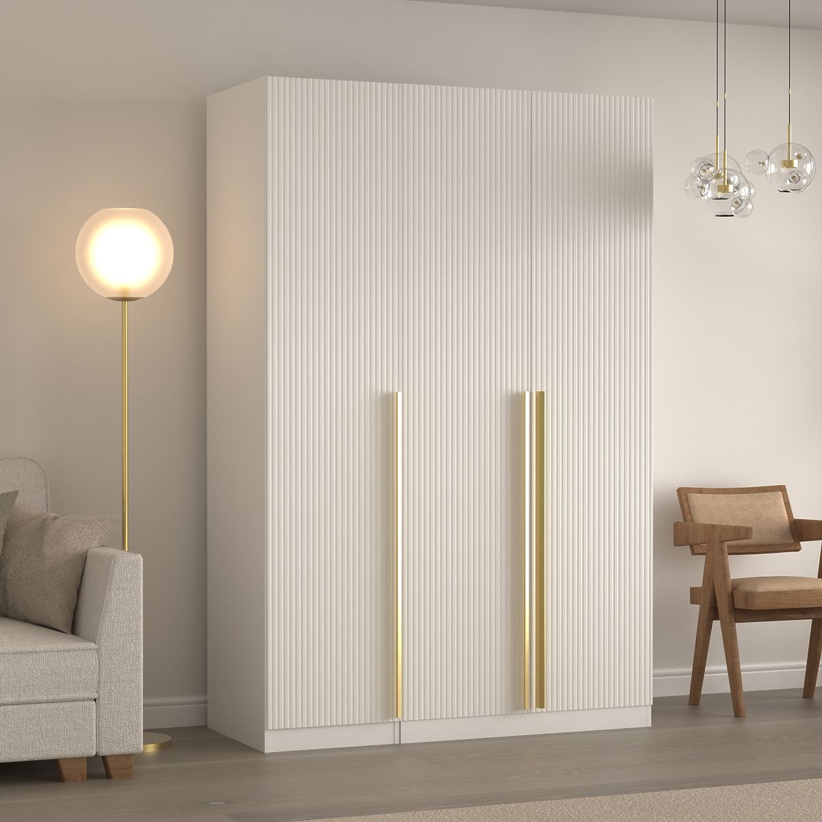 Dreiflügeltüriger Schrank mit konfigurierbarem Innenraum und dekorativen Rillen. .. mehr