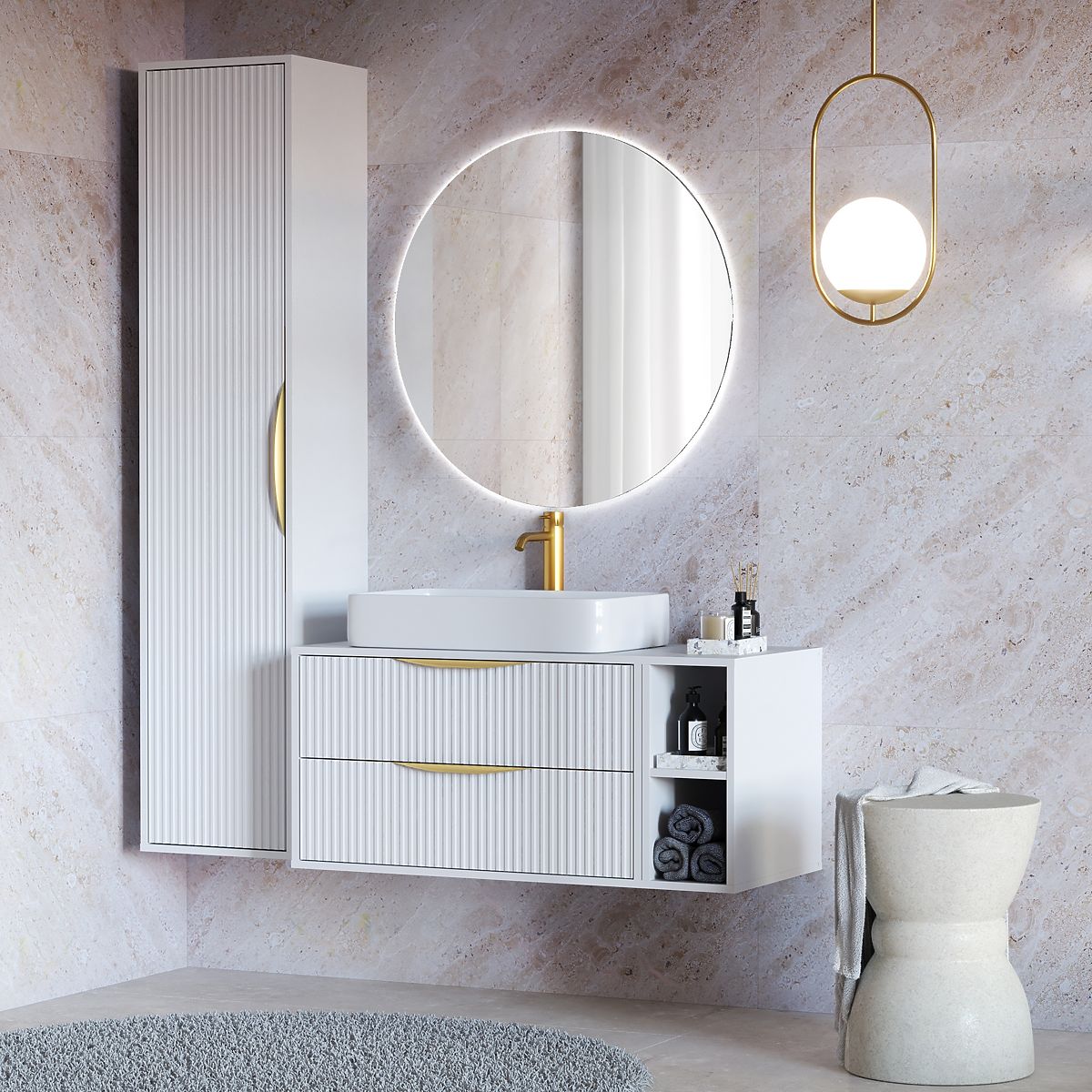 Gerillter Waschtischunterschrank mit goldenen Griffen und Soft-Close-Schubladen. .. mehr