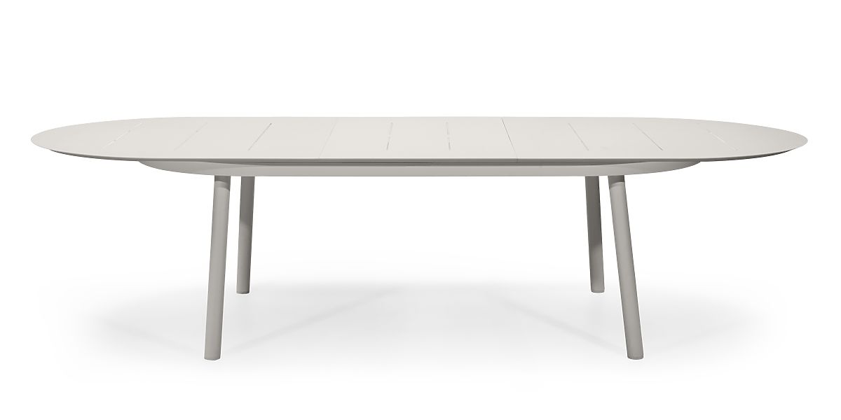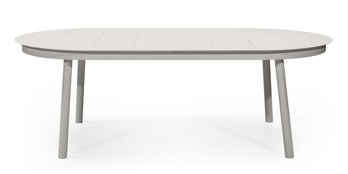 Ovale, ausziehbare Tischplatte aus hellbeigem Aluminium. .. mehr