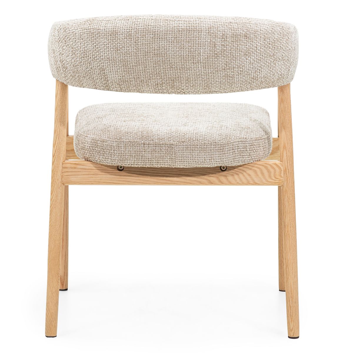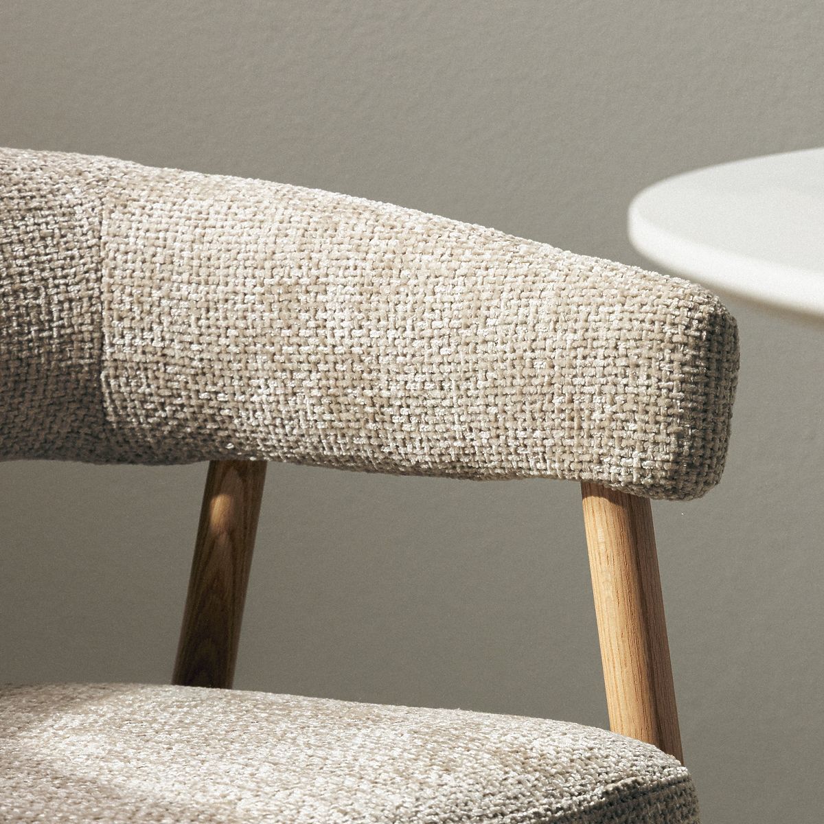 Gepolsterter Stuhl mit Eichenholzbeinen und abgerundetem Design. .. mehr