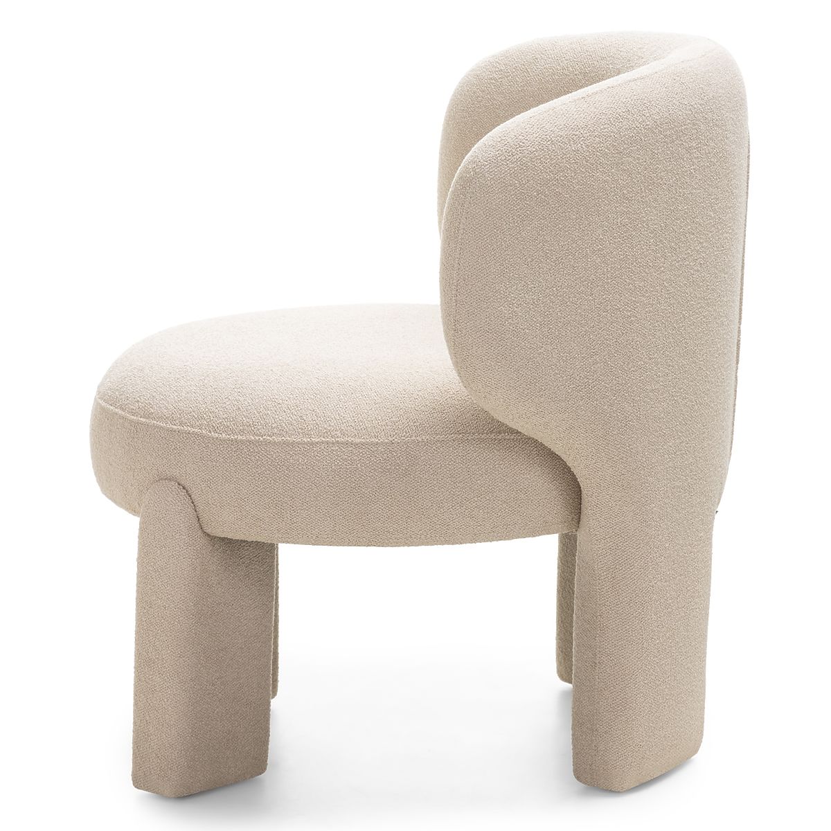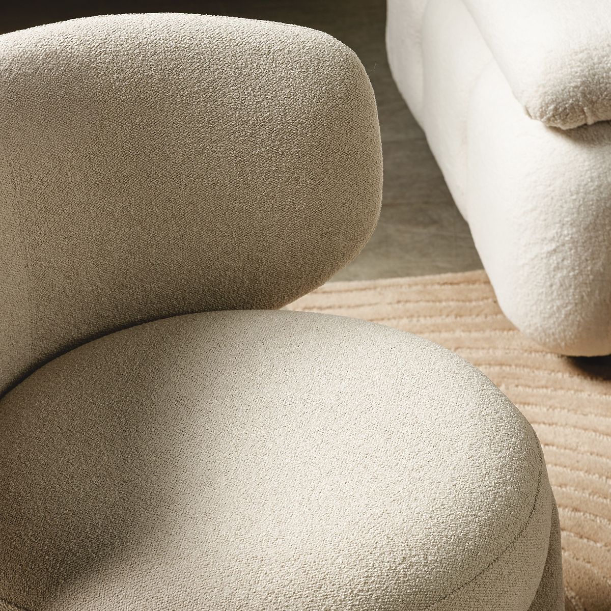 Beiger Bouclé-Sessel mit abgerundeten Formen für modernen Komfort. .. mehr