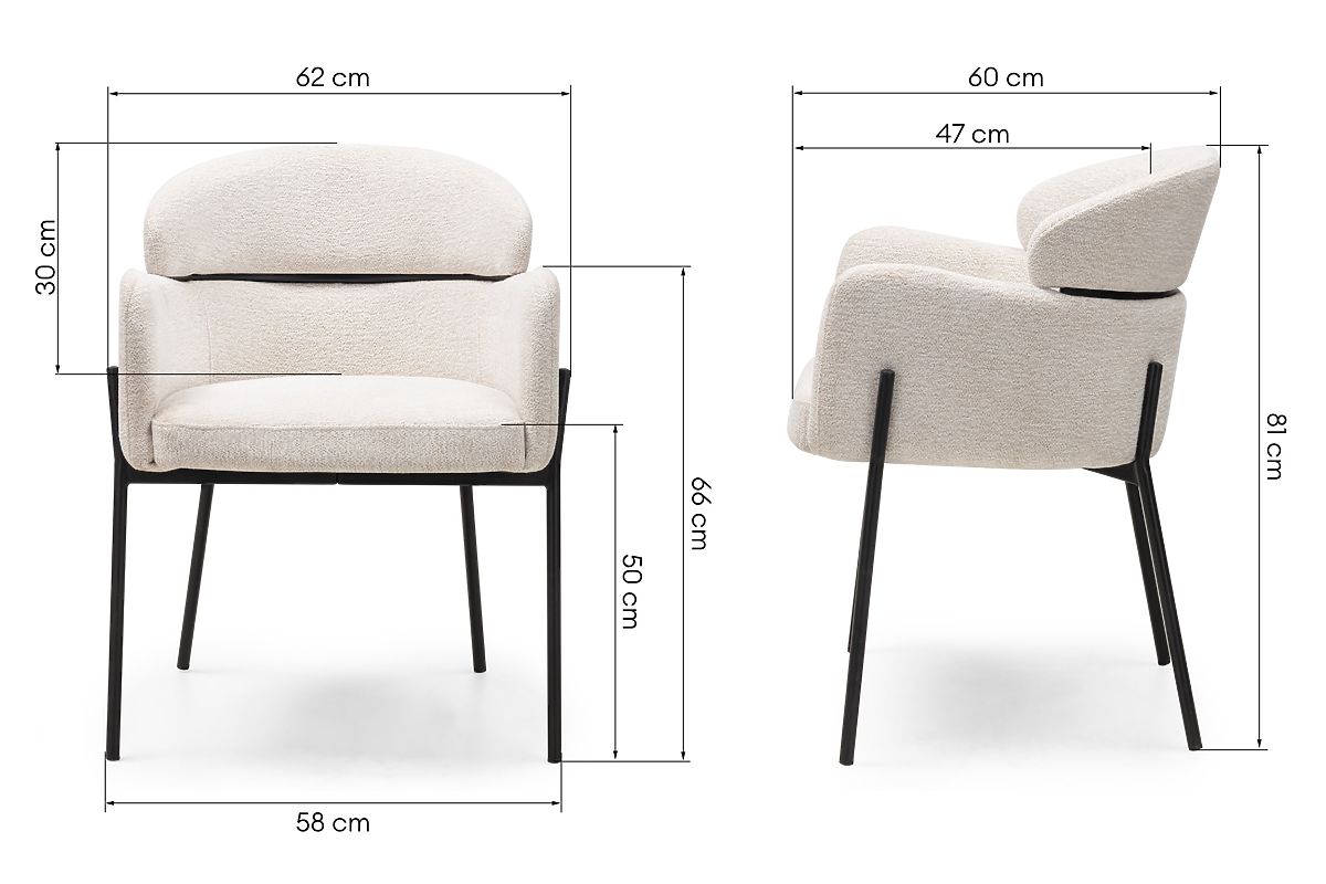 Moderner Ecru-Stuhl mit schwarzen Metallbeinen und Armlehnen. .. mehr