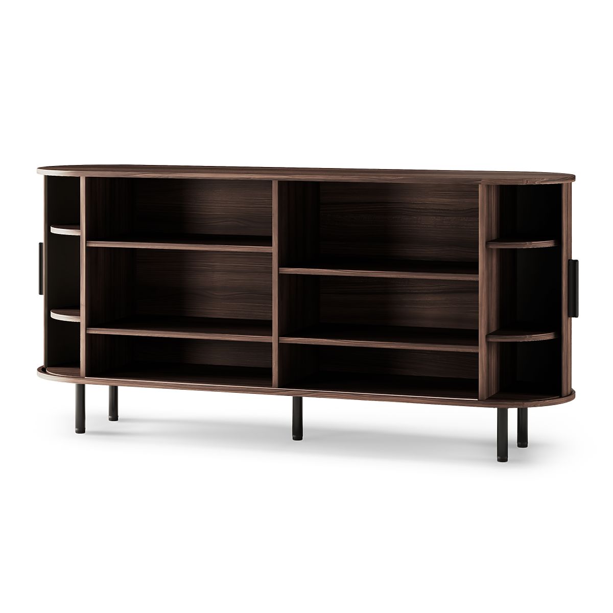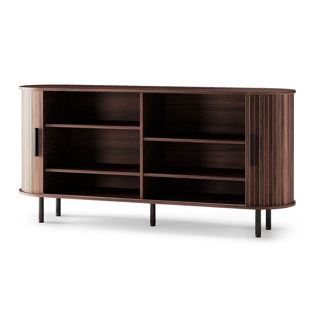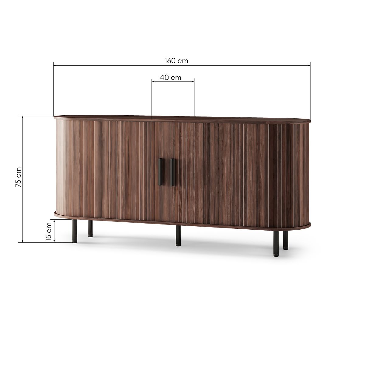 Die abgerundete Kommode Gliss mit Lamellen in dunkler Walnussfarbe. .. mehr