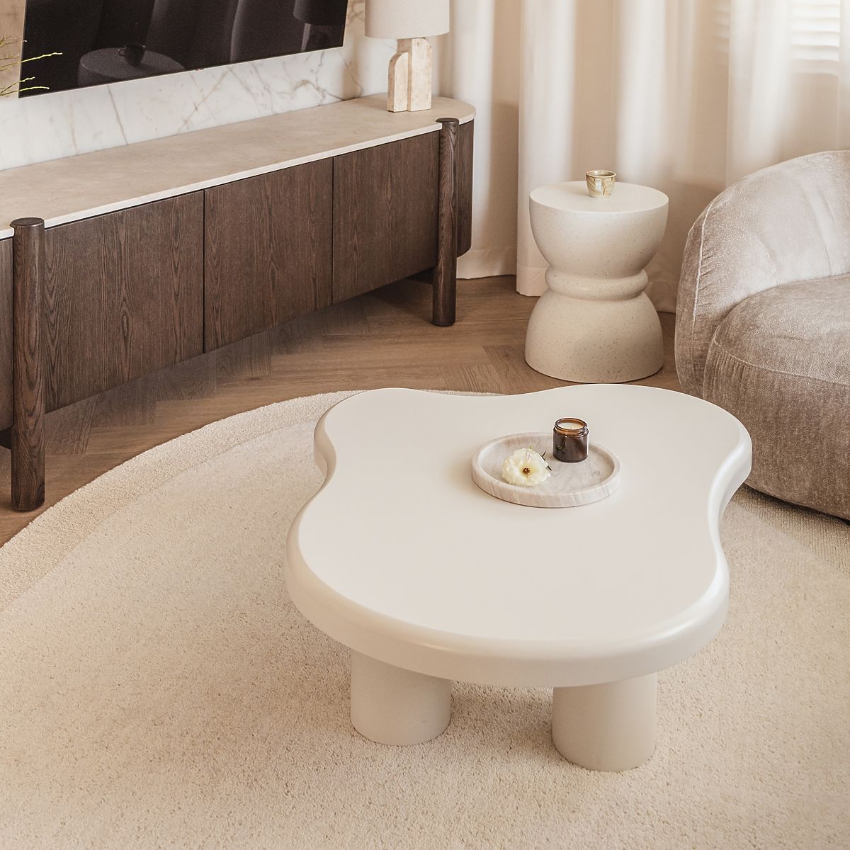 Moderner Couchtisch mit unregelmäßiger Platte in Weiß. .. mehr