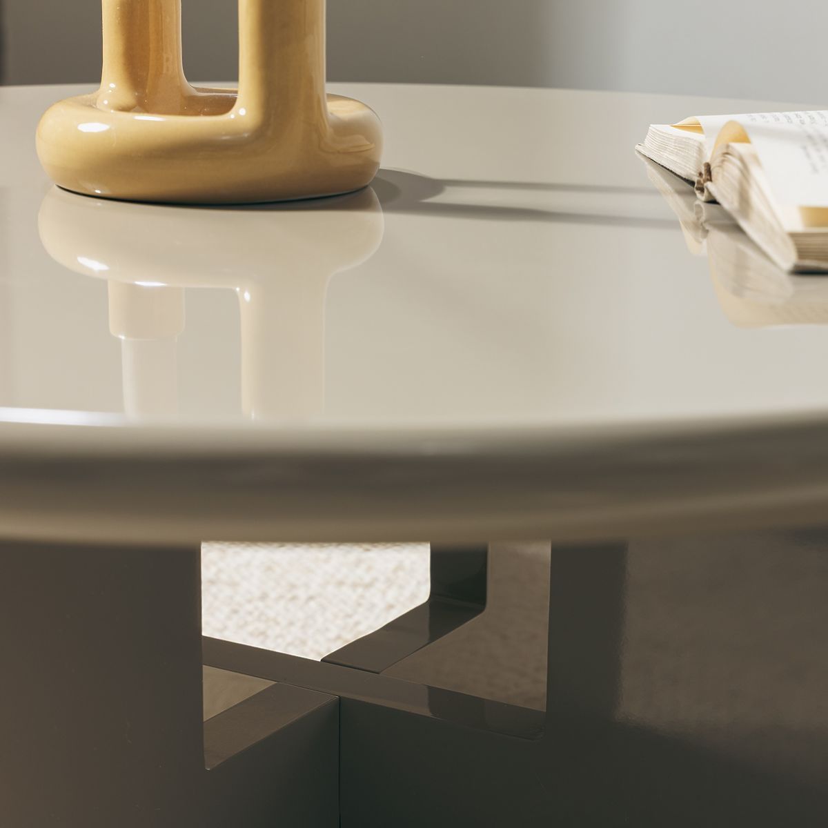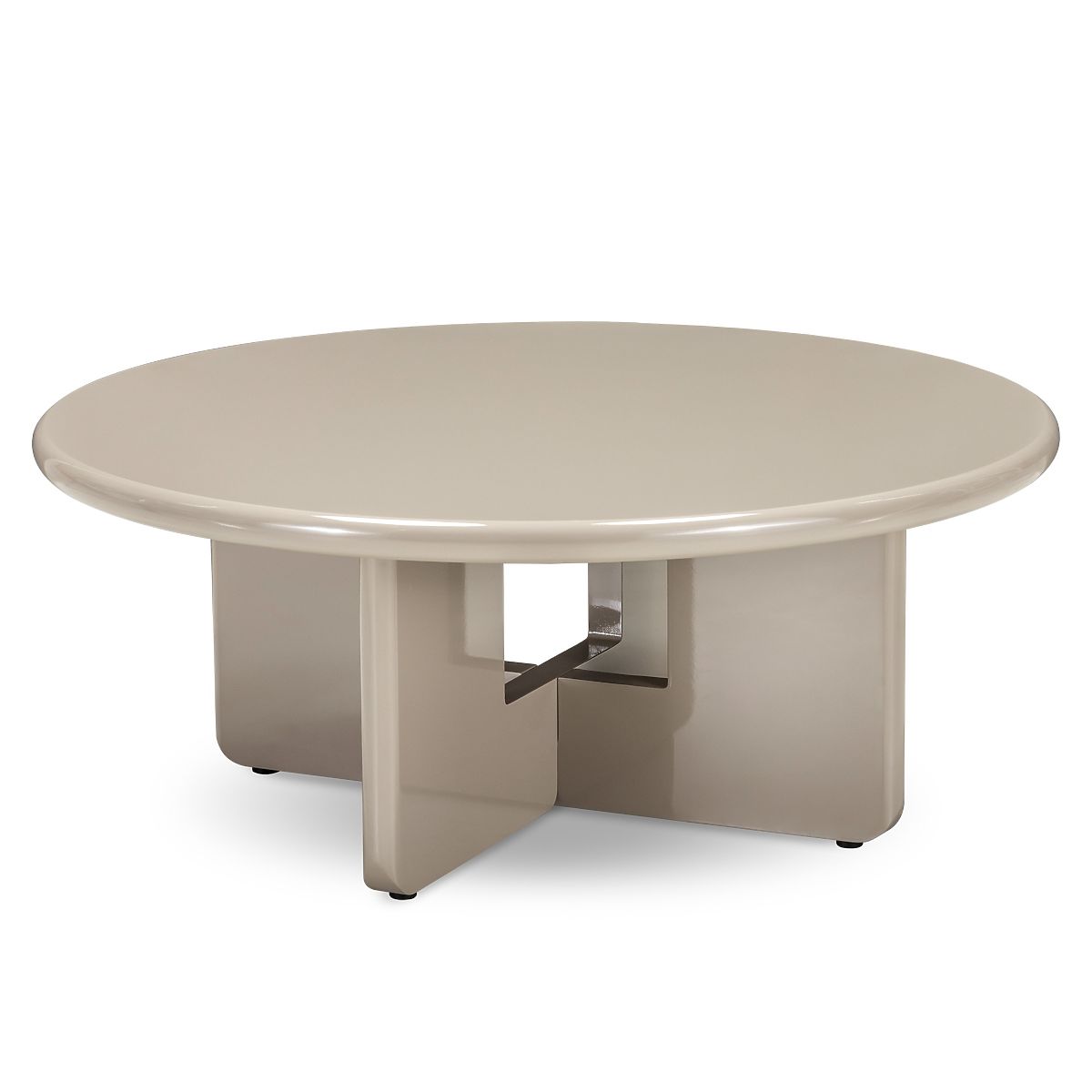Beiger, glänzender Couchtisch mit Ø80 cm runder Platte. .. mehr