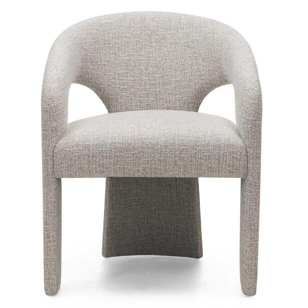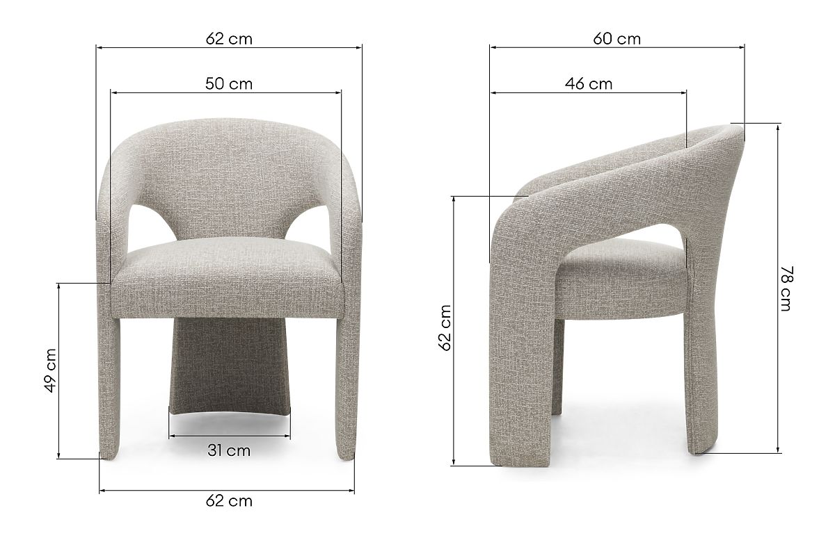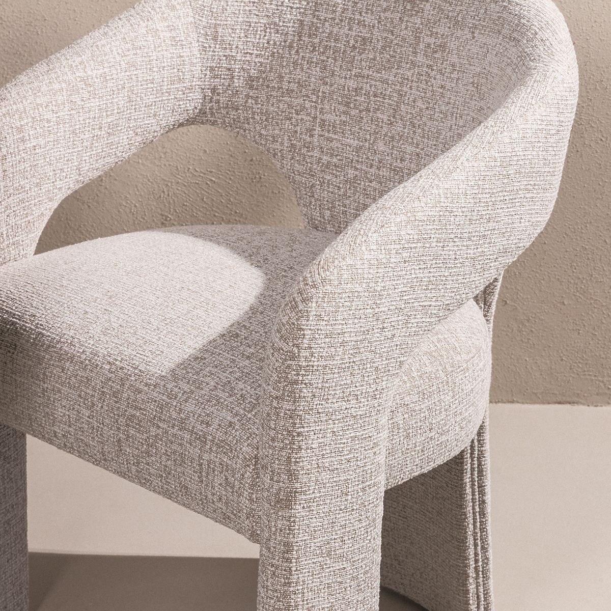 Beige-cremefarbener Stuhl mit weichem Sitz und abgerundeten Formen. .. mehr
