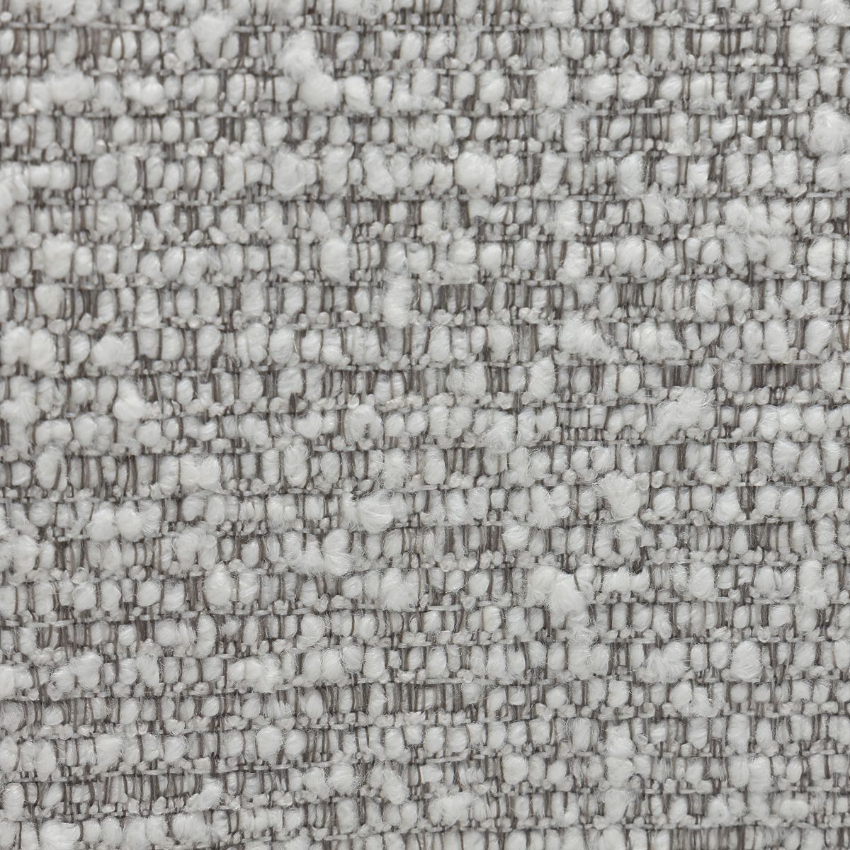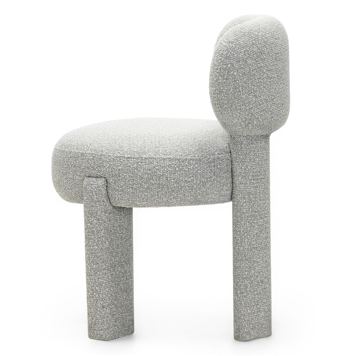 Gepolsterter Stuhl mit grauem Bouclé-Stoff und abgerundeten Formen. .. mehr