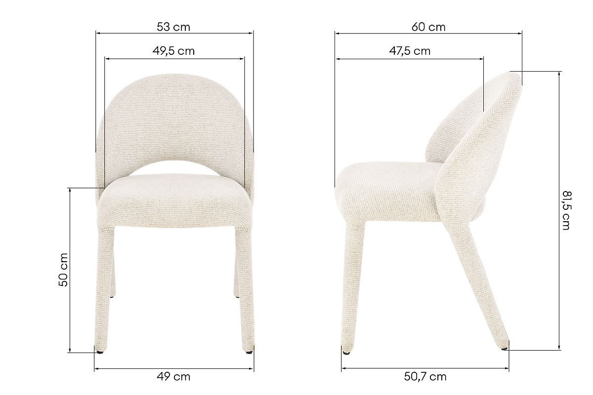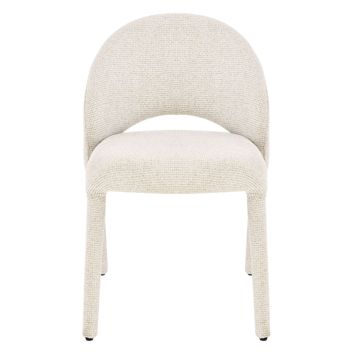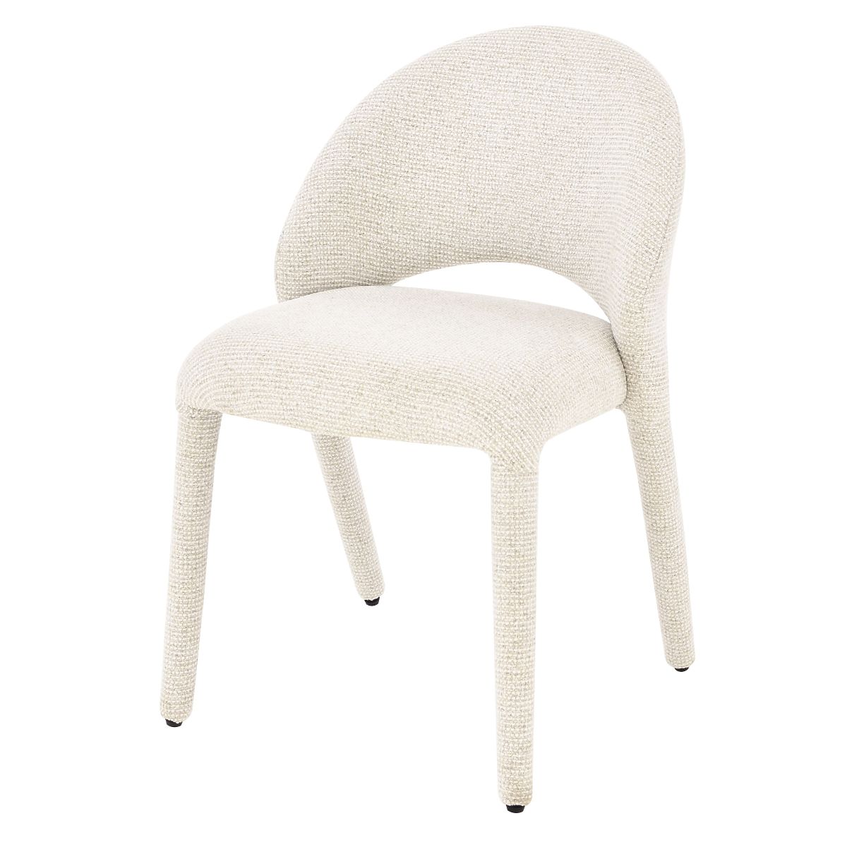 Gepolsterter Stuhl mit beigem Stoffbezug und gerundeter Rückenlehne. .. mehr