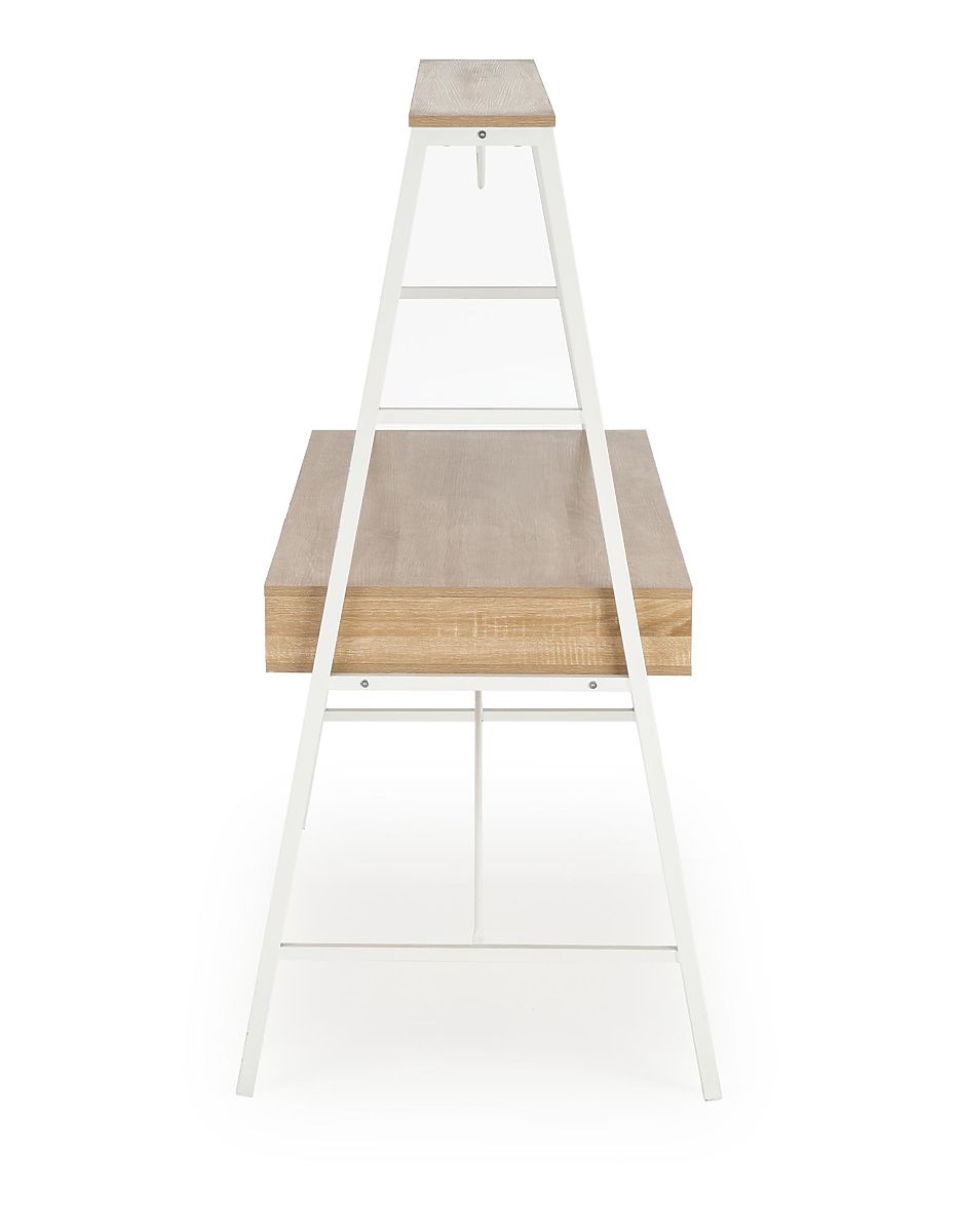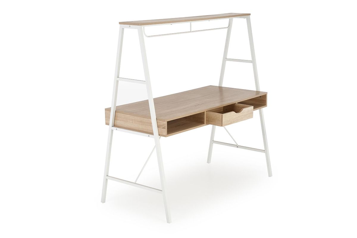 Dieser moderne Schreibtisch ist eine hervorragende Wahl für das Homeoffice, das Büro, das Kinder- oder Jugendzimmer. Er vereint Funktionalität, Haltbarkeit und stilvolles Design in einer angenehmen hellen Holzoptik, ergänzt durch weiße Elemente. Die Arbeitsfläche bietet ausreichend Platz für Computerarbeit, Studium oder Dokumentenorganisation. Der Tisch ist mit praktischen Aufbewahrungsmöglichkeiten ausgestattet, die helfen, den Arbeitsbereich übersichtlich zu halten. Die Frontteile sind aus hochwertigem MDF mit matter Oberfläche gefertigt, während der stabile Korpus aus einer soliden Metallkonstruktion besteht, ebenfalls in matter Ausführung. Dank der universellen Ausrichtung lässt er sich leicht in verschiedene Raumtypen integrieren und mit modernen Interieurs kombinieren.
