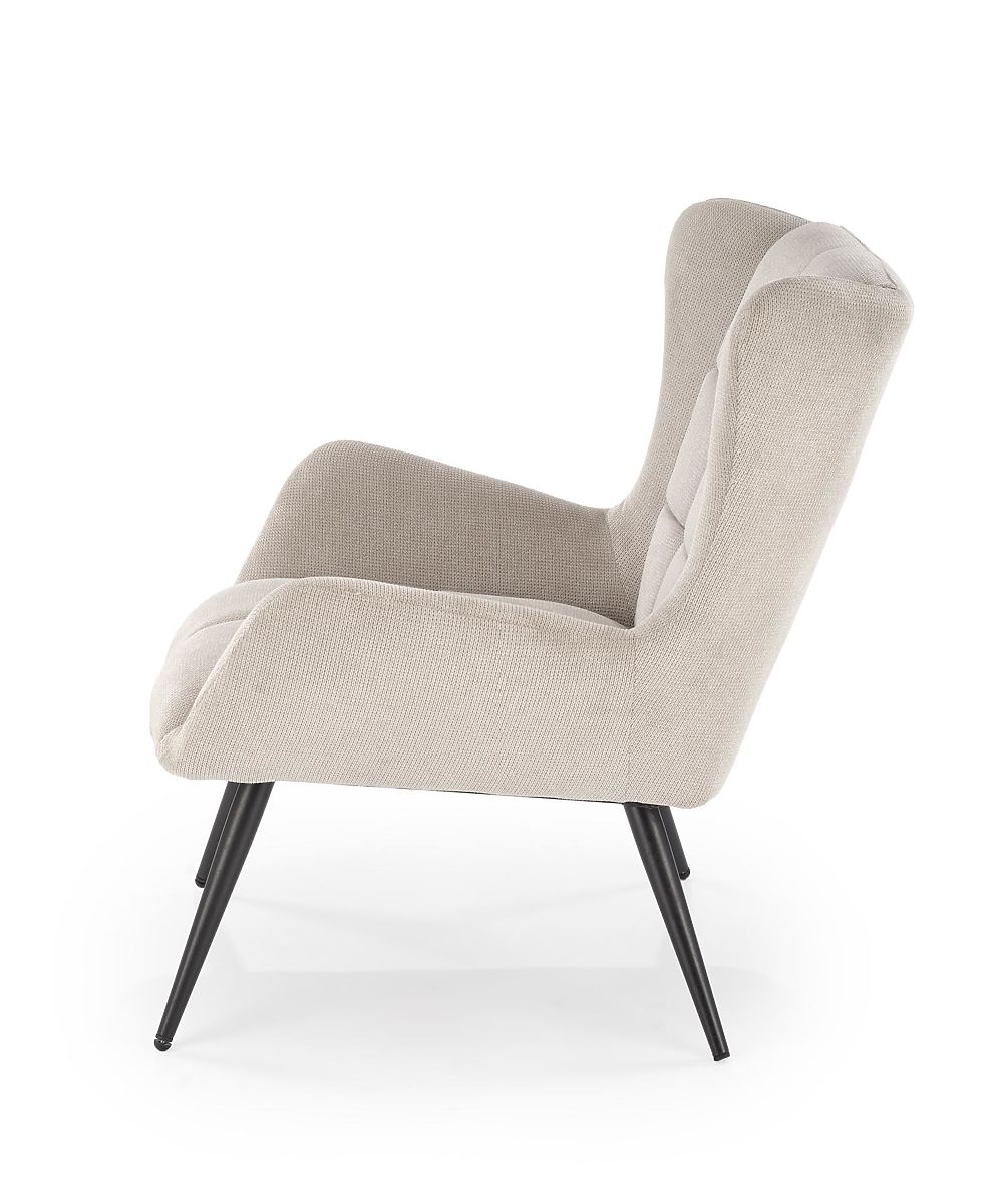 Beiger Relaxsessel aus Stoff und Stahl. .. mehr