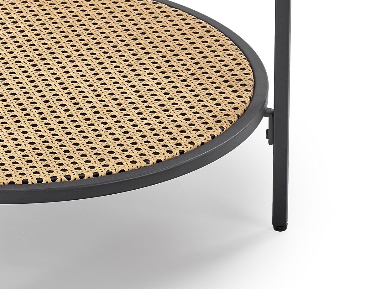 Runder Couchtisch aus Glas und Rattan in rauchiger Naturfarbe. .. mehr