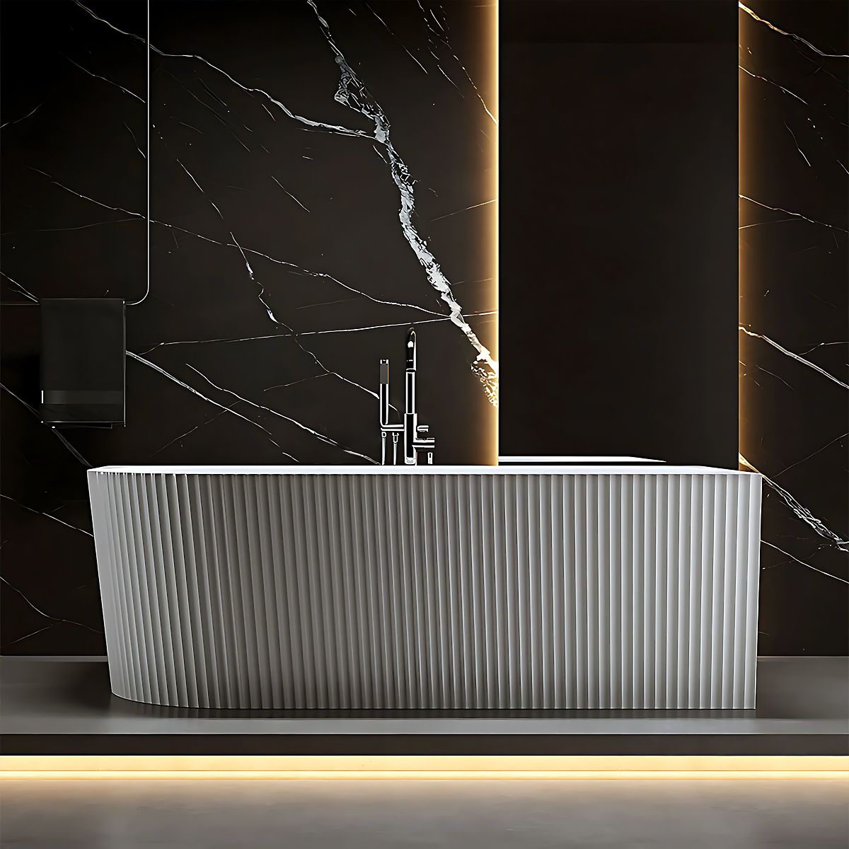 Die moderne gerillte Badewanne ist eine Kombination aus einzigartigem Design und außergewöhnlichem Komfort. Ihre charakteristische, vertikal gerillte Oberfläche verleiht dem Interieur einen originellen Charakter und passt perfekt zu modernen, glamourösen oder minimalistischen Badezimmerarrangements.