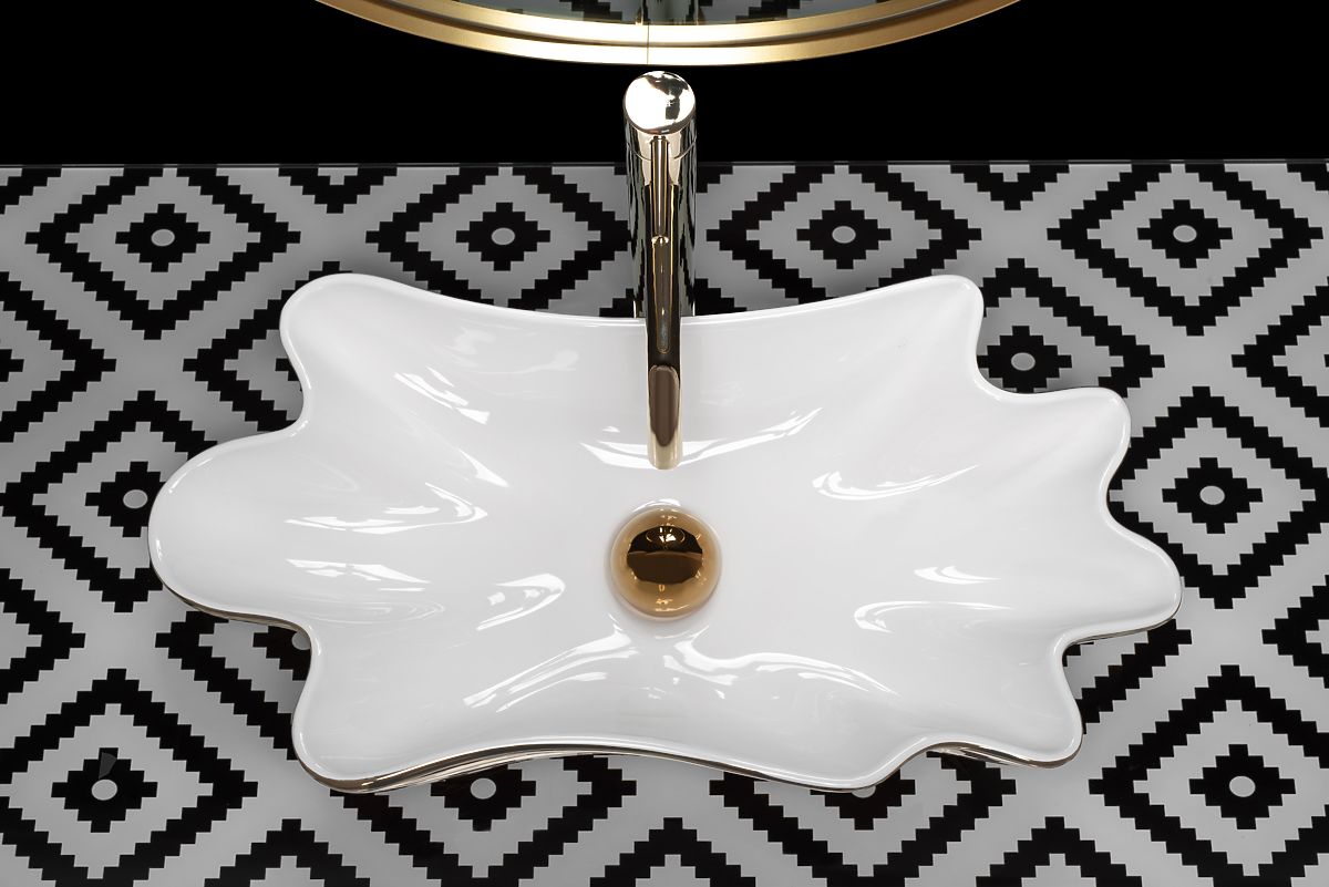 Ein Waschbecken aus hochwertiger Keramik in Weiß mit einer ovalen, wellenförmigen Form. Das Waschbecken ist mit einem goldenen Rand versehen, der einen schönen abschließenden Effekt verleiht. Es ist unglaublich attraktiv anzusehen und ideal für Liebhaber von unkonventionellen Formen, bringt Eleganz in die Badezimmergestaltung zu Hause und im Büro.
